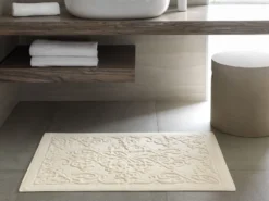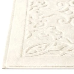 Thira is a beautiful jacquard mat formed by the contrast of Terry and smooth surfaces of the fabric. The floral ornament and the pastel shade of ecru will look great in bathrooms.