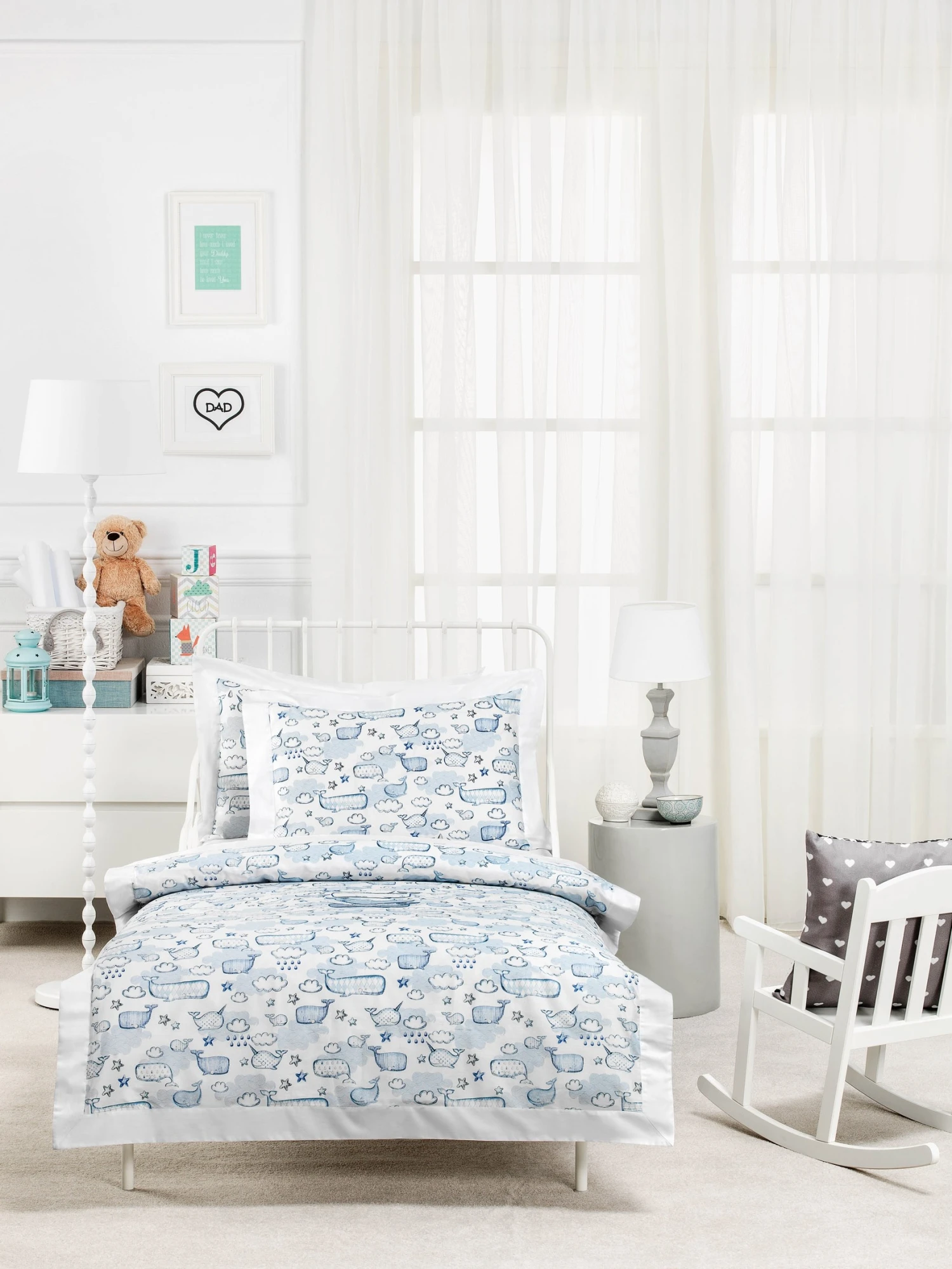 Set “Sea adventures”, made in blue and blue tones, reminiscent of the sea and its mysterious inhabitants – whales, but these creatures have an unusual, fabulous look, these characters come in good dreams.