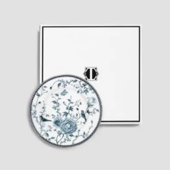 A small refined plate is decorated with a pattern made in the decal technique. The plates in the Fiore collection feature an exquisite medium blue pattern and a glittering gilded edging around of the plate. Such dishes are reminiscent of the famous English Wedgwood porcelain with its characteristic fine ornaments.
