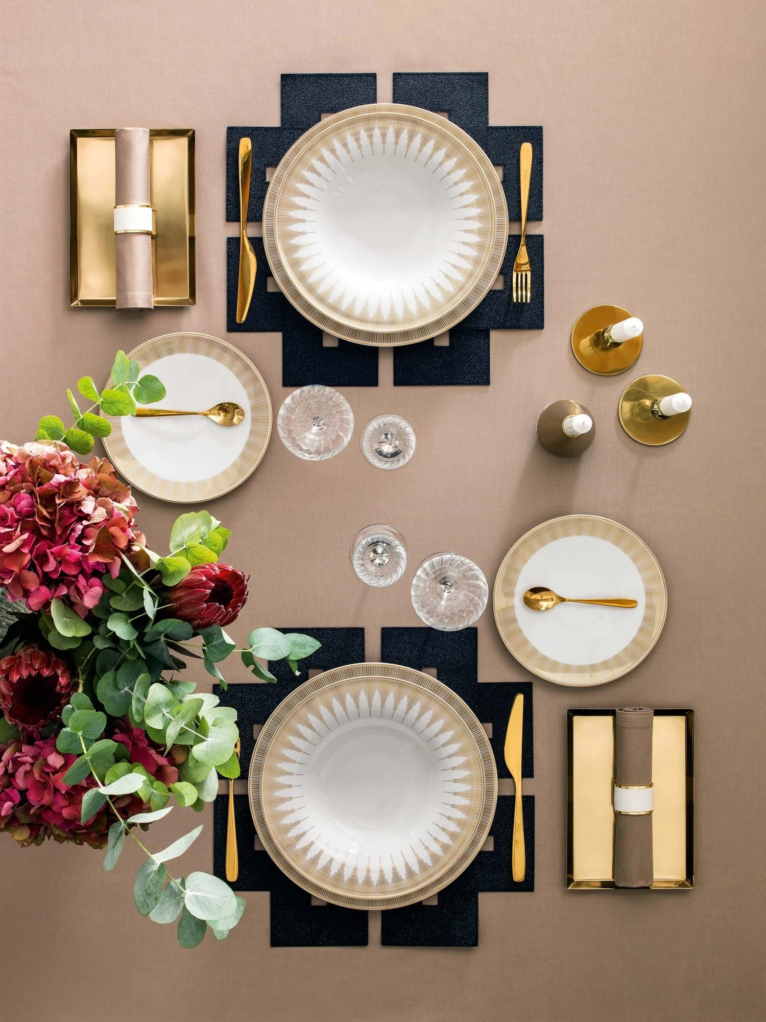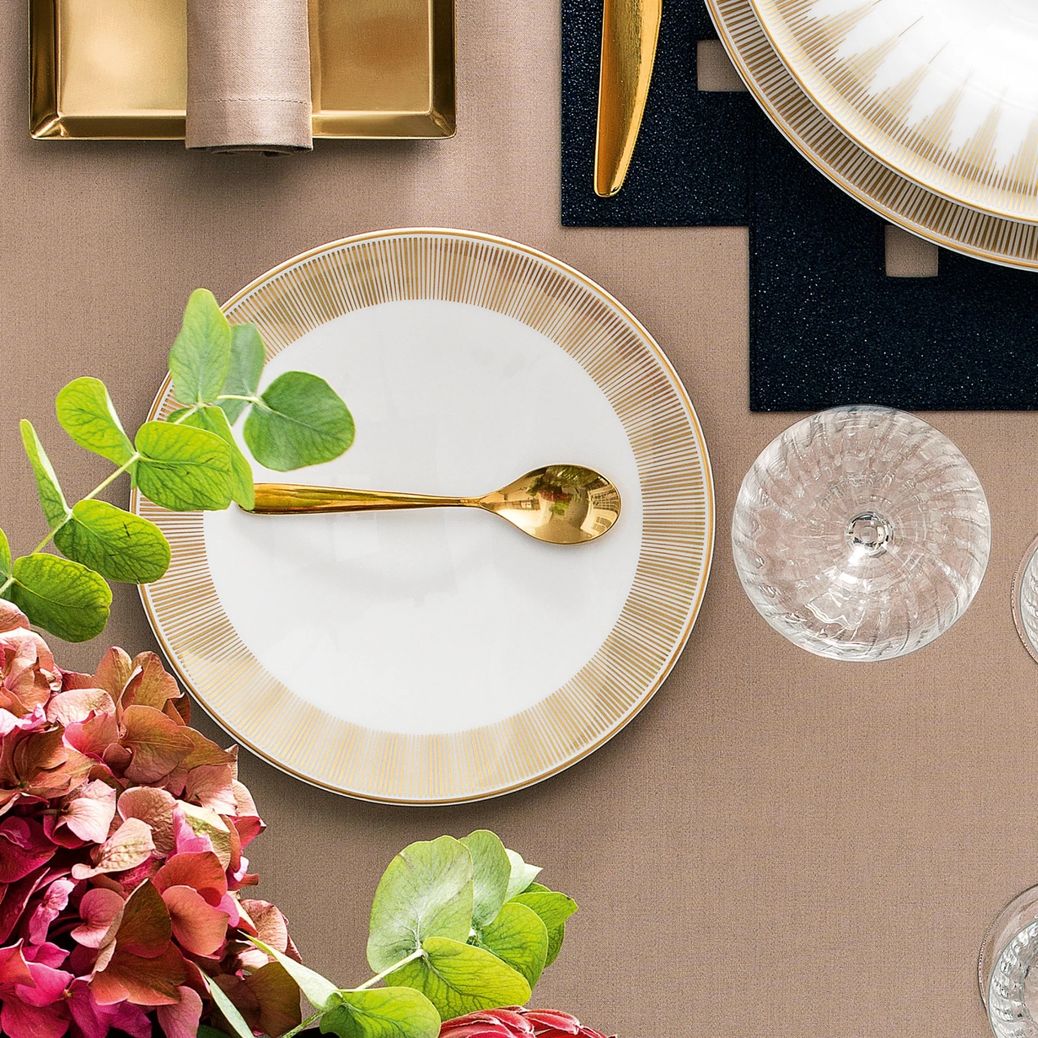 A small dessert plate is decorated with an elegant pattern a la Art Deco made of 24 carat gold. Sun rays pattern was the most popular during the heyday of Art Deco. The tableware of the Madison collection will decorate a traditional dining room as well as a modern styled one. The plates look exquisite and posh and a gold rim will sparkle beautifully in the evening light.