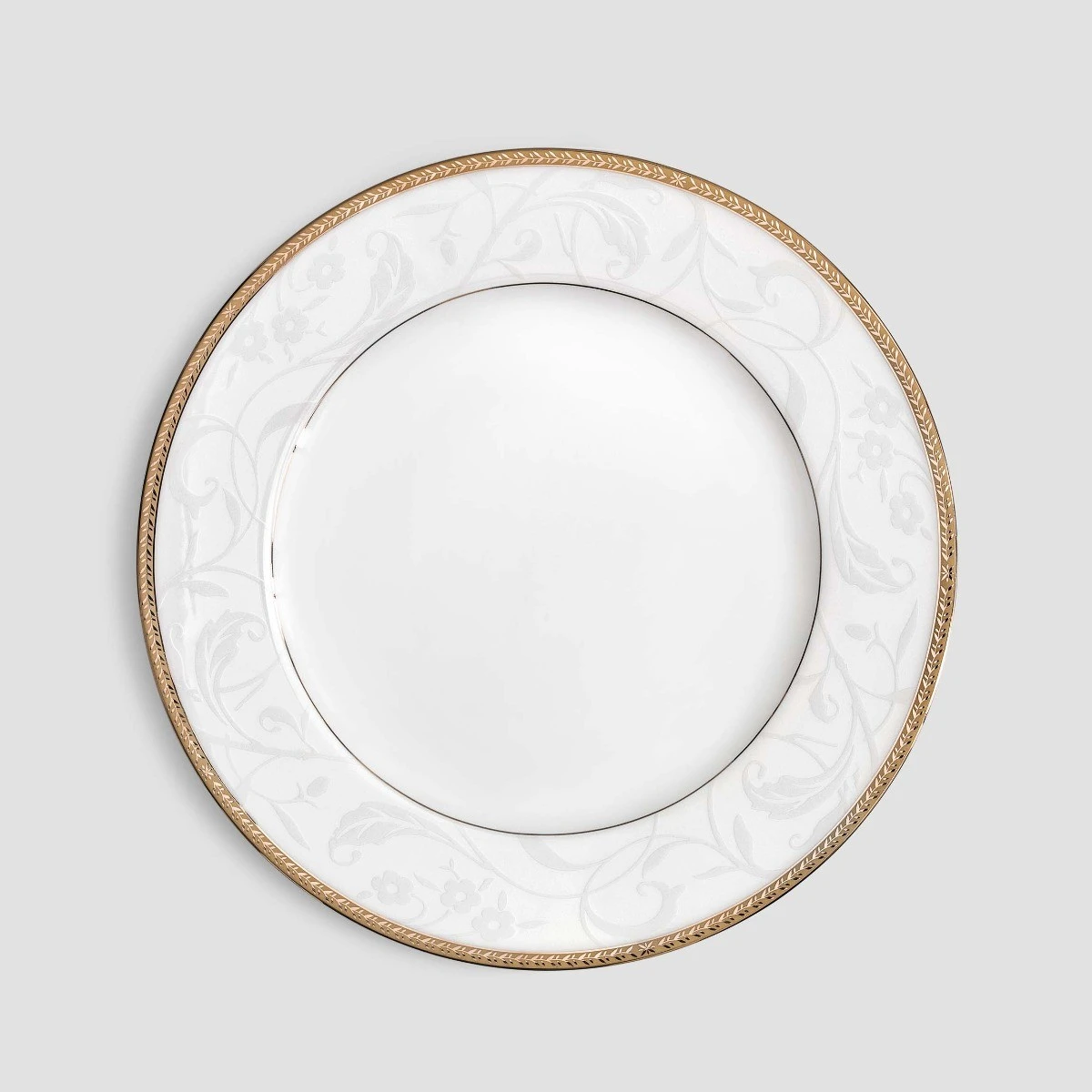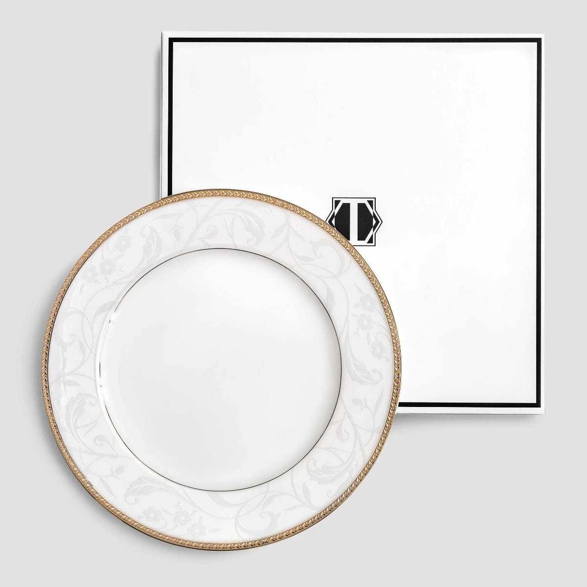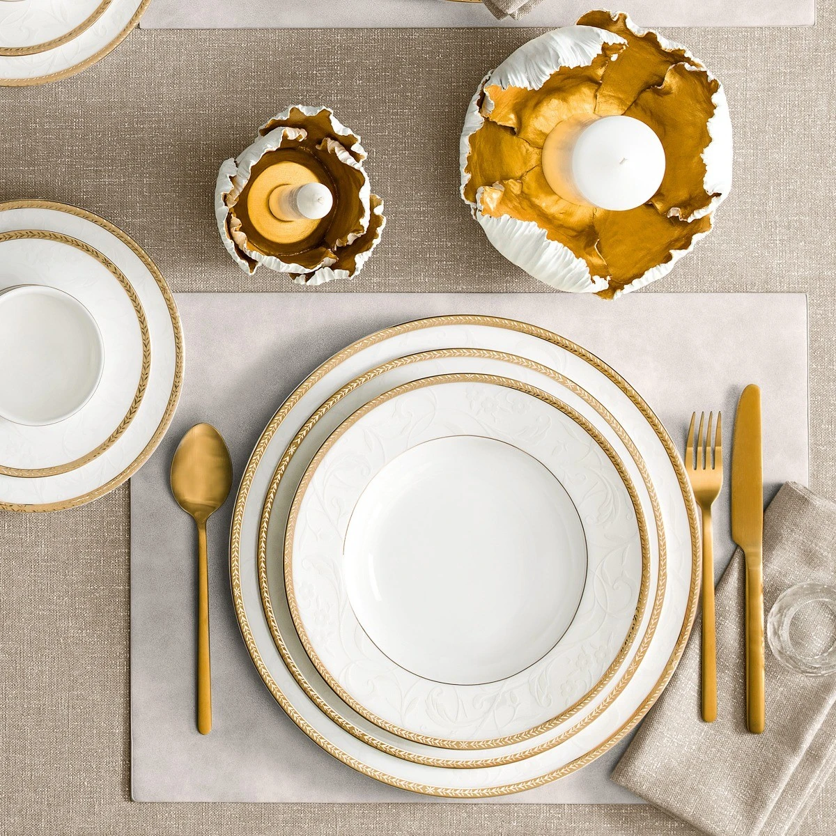 A dinner plate is decorated with a textured classic pattern and a shiny 24 carats gold rim. Such tableware looks exquisite and a gold rim will sparkle beautifully in the evening light. The Baglioni plates set will be a center-piece of any celebration.