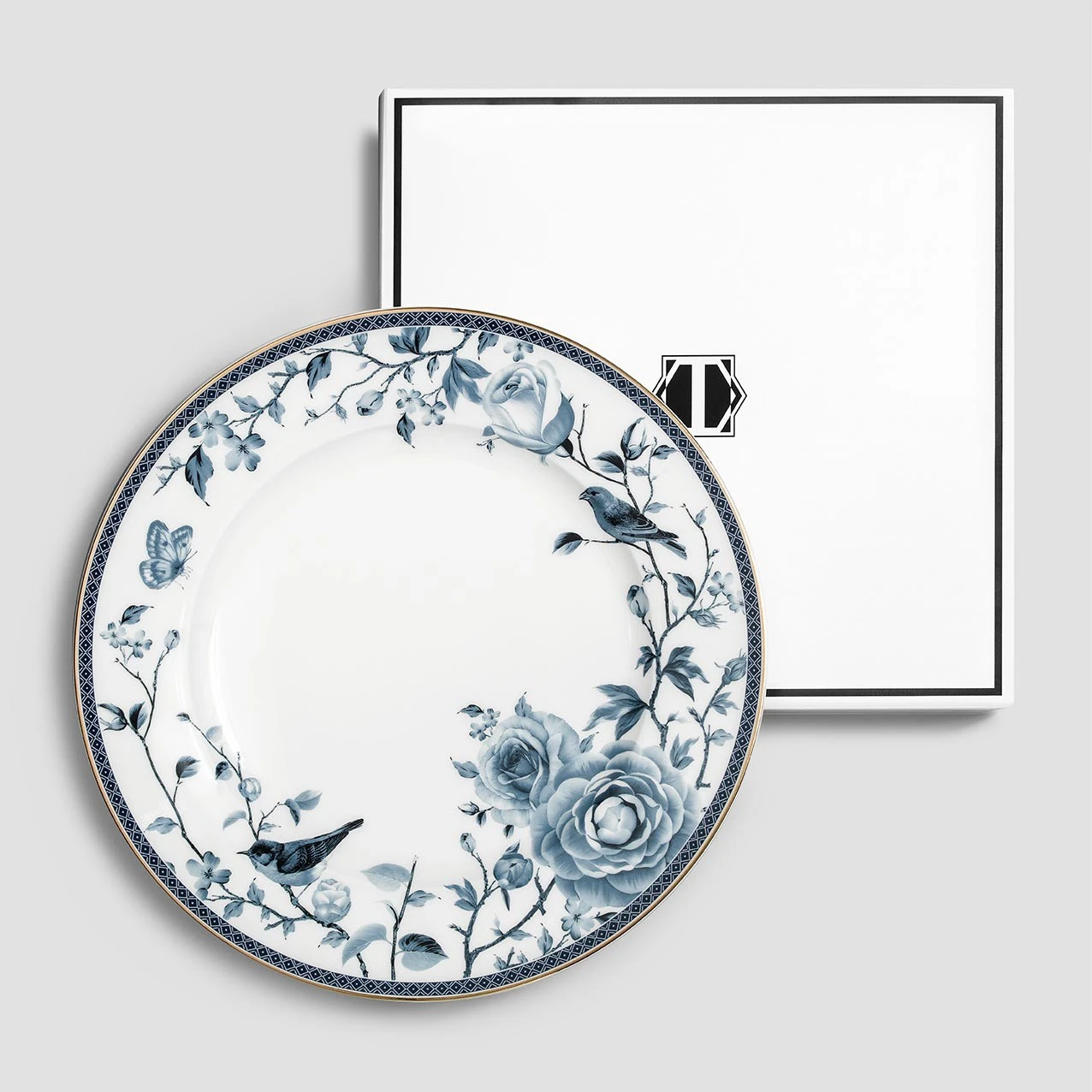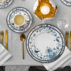 A dinner plate is decorated with a pattern made in the decal technique. The plates in the Fiore collection feature an exquisite medium blue pattern and a glittering gilded rim around of the plate. Such dishes are reminiscent of the famous English Wedgwood porcelain with its characteristic fine ornaments.