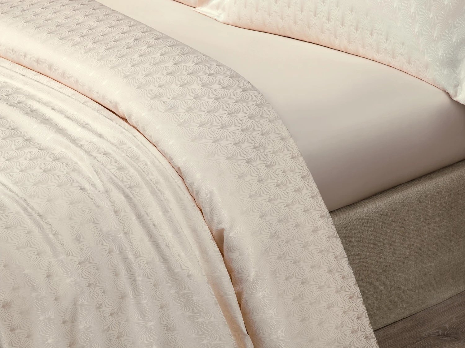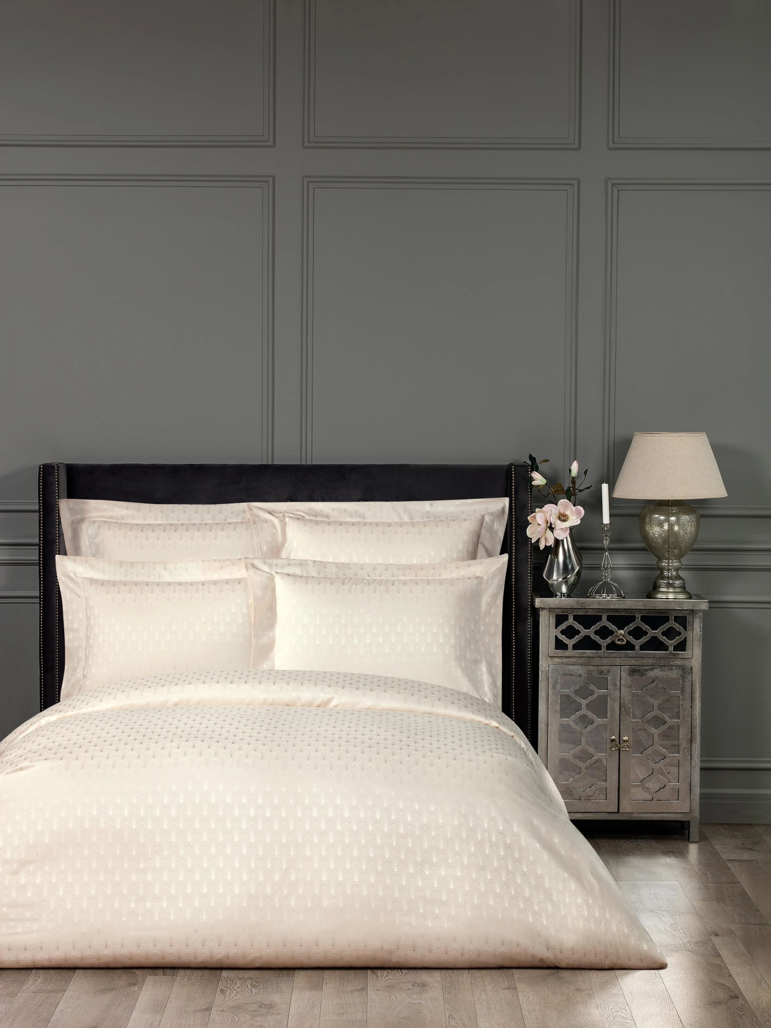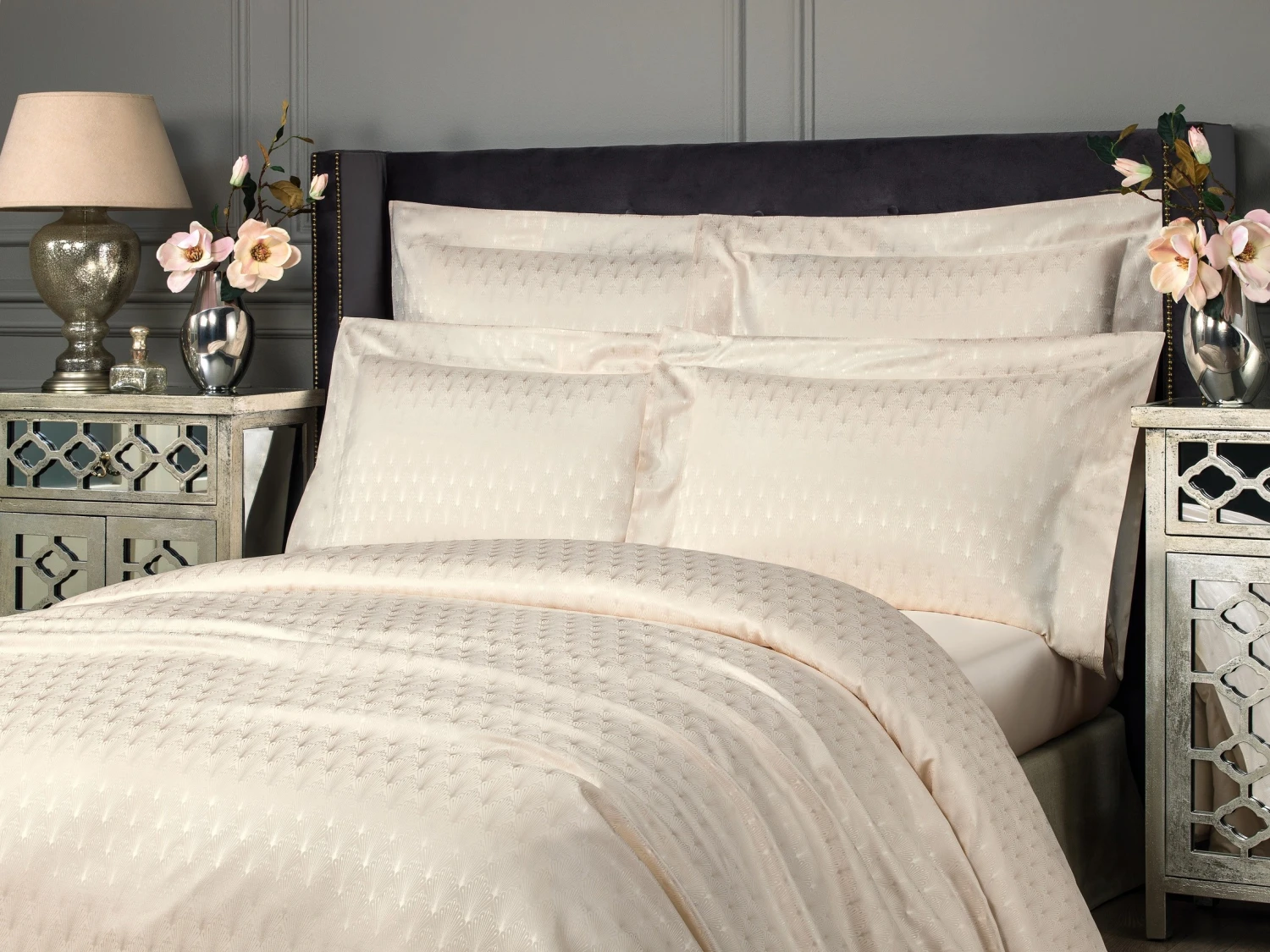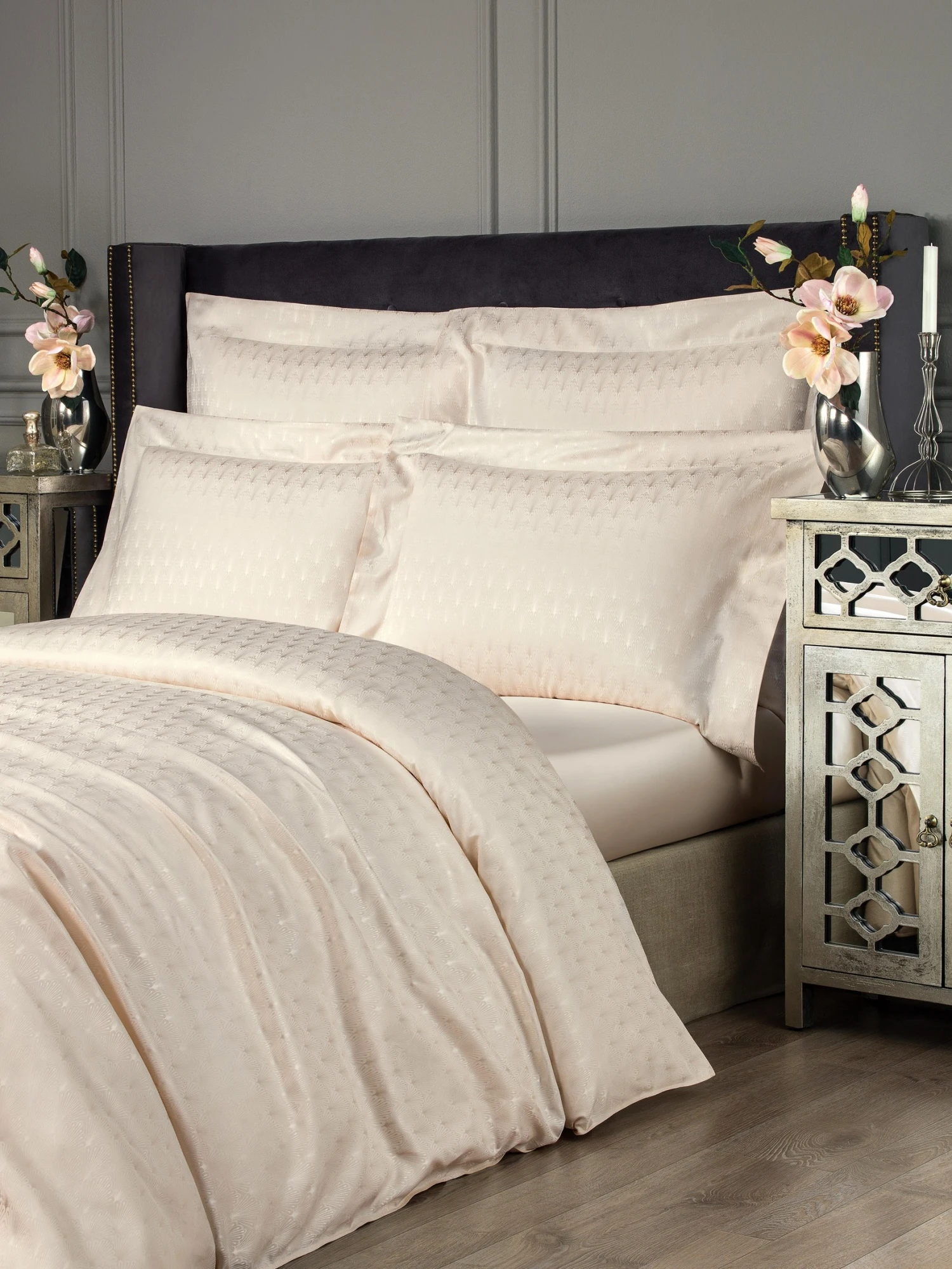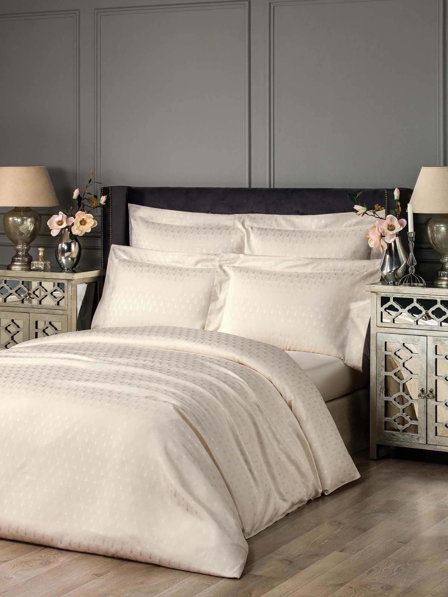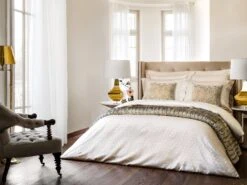 Palmetto was widely used in the days of the Egyptian pharaohs, later in ancient culture, it is one of the iconic ornaments of the Art Deco era. The set is decorated with decorative borders of smooth satin silk around the perimeter of the pillowcases and the front of the duvet cover, made of the same fabric and sheet, silky and very pleasant to the touch. Bed linen is made of long-fiber cotton of the highest quality, which ensures high hygiene and durability. The exquisite jacquard model combined with elegant art Deco ornament is the style and elegance of the bedroom interior.
