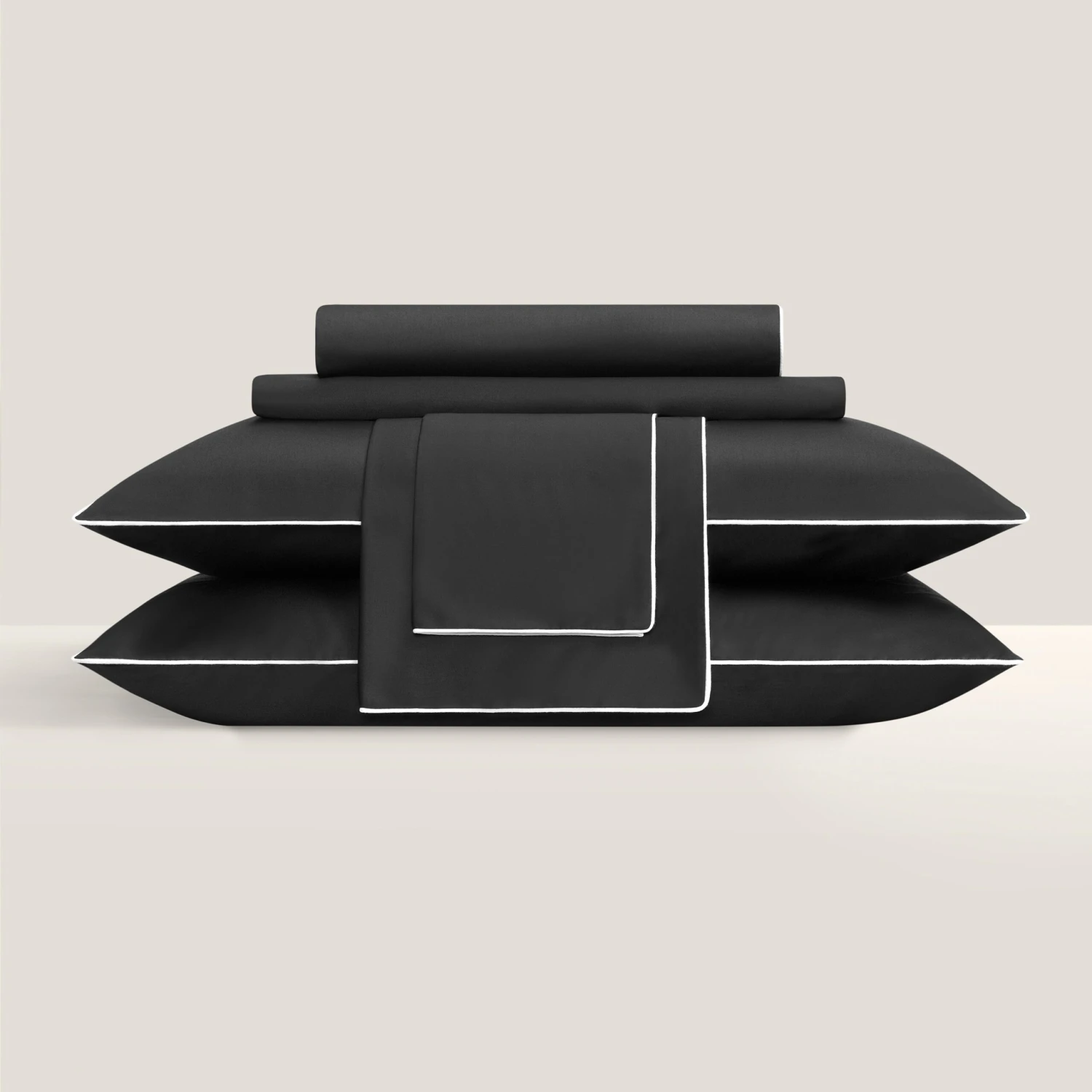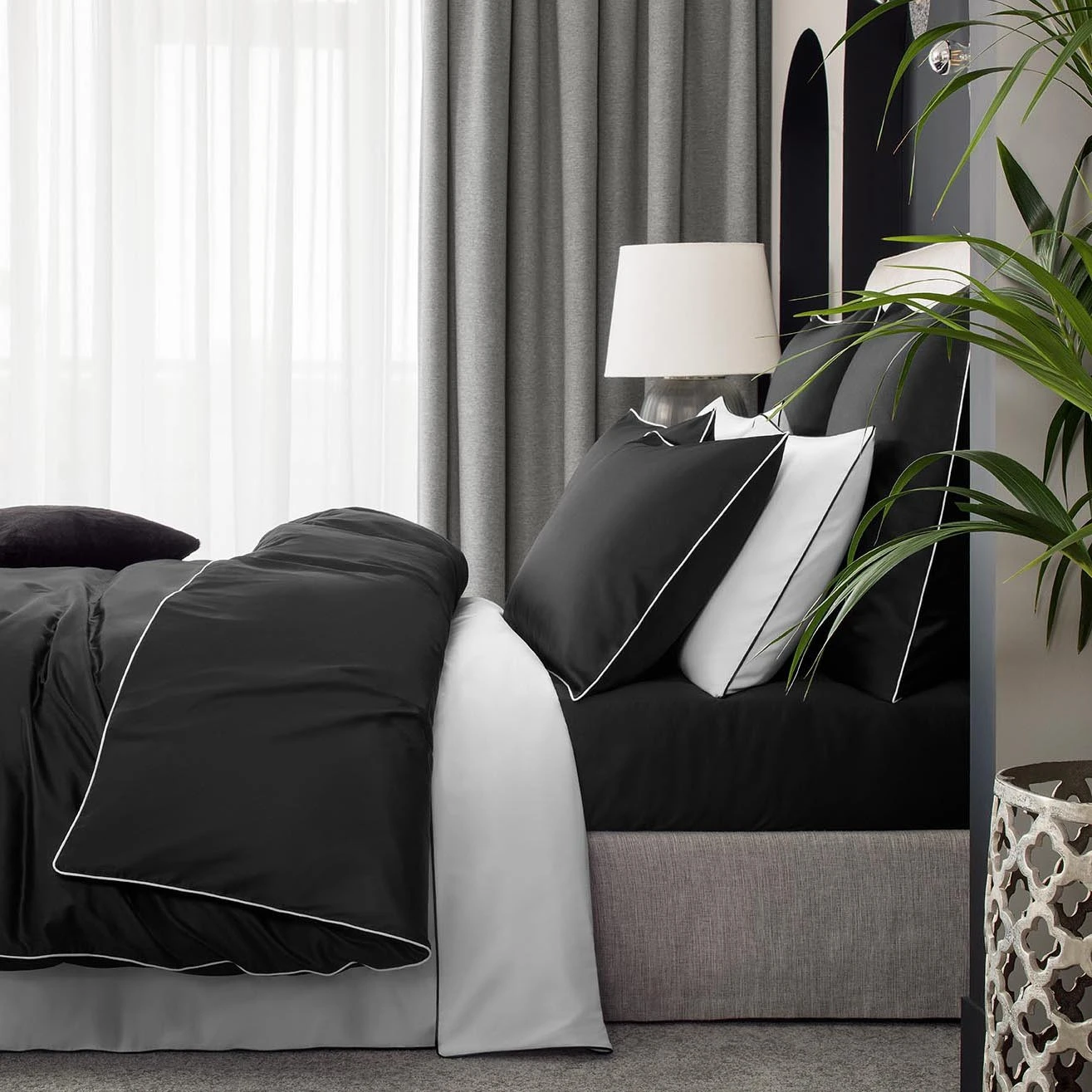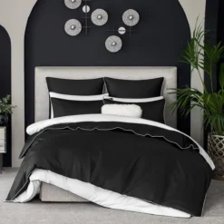 of “Clarity” is a contrasting decorative piping in black, framing pillowcases and a duvet cover on four
