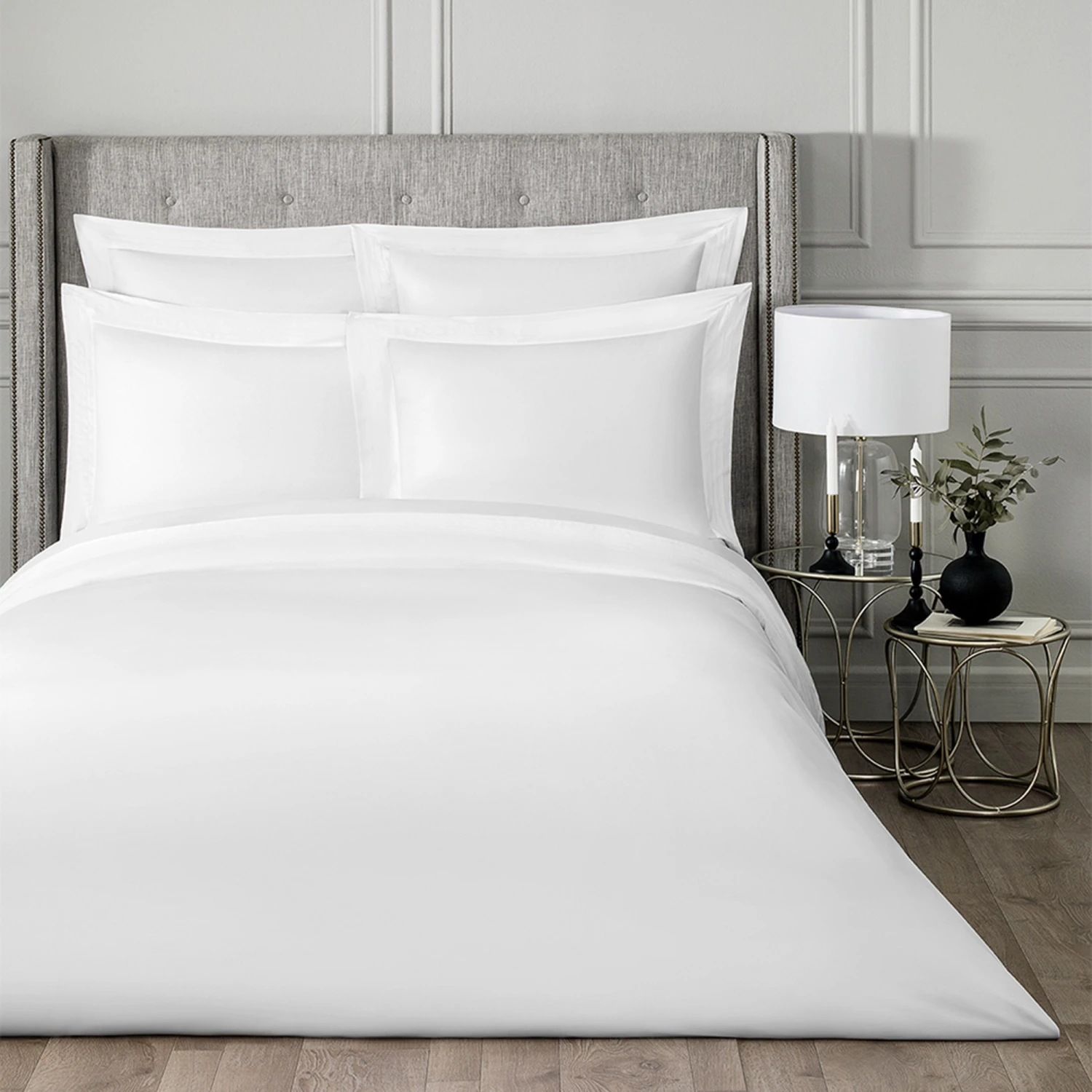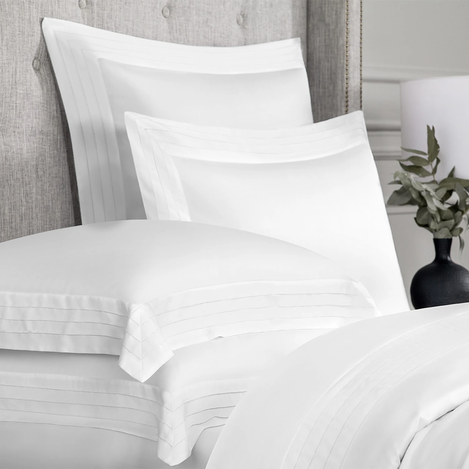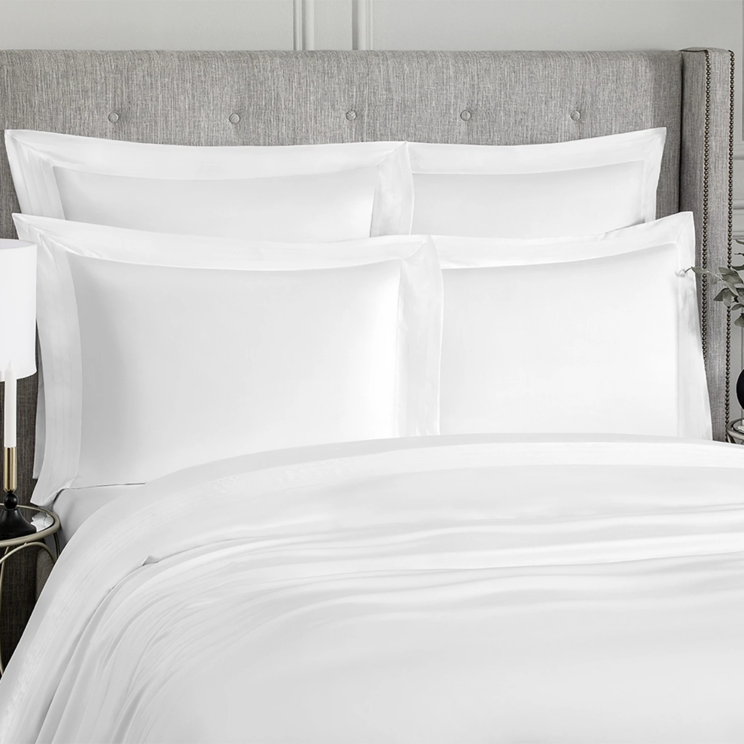 A wide decorative border with a complex finishing stitch adorns the upper part of the duvet cover. Snow-white fabric combined with a silver–gray border is an exquisite European classic in interior design. Plain linen in pastel shades will look perfect in both traditional and modern interiors.