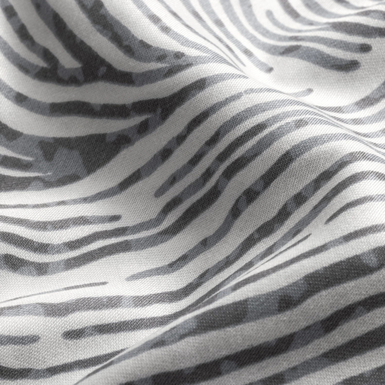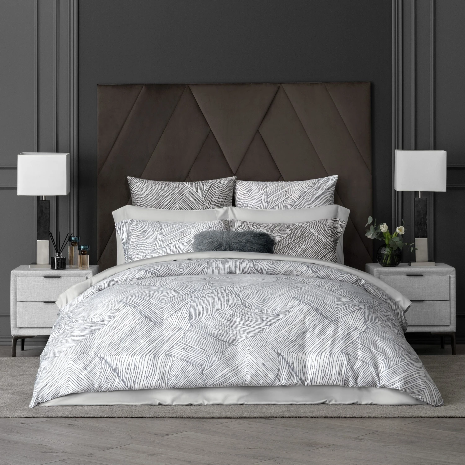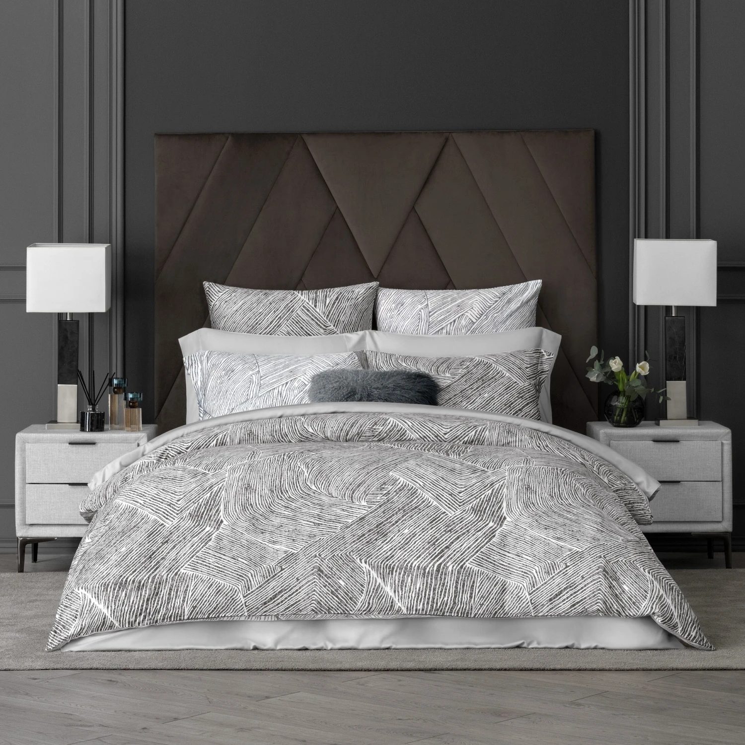 Ferrante impresses with its unusual animalistic design and striking contrasts. There are only two colors – grey and white. The duvet cover is double-sided, the shades change to lighter, smoky-grey ones on the reverse side. Complex interlacing stripes of a monochrome ornament resemble a stylized pattern of striped zebra skin.
