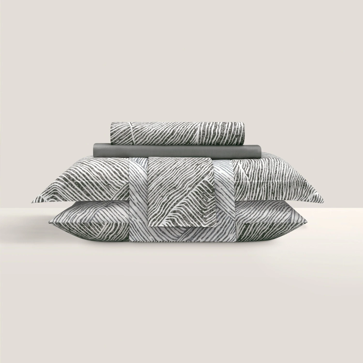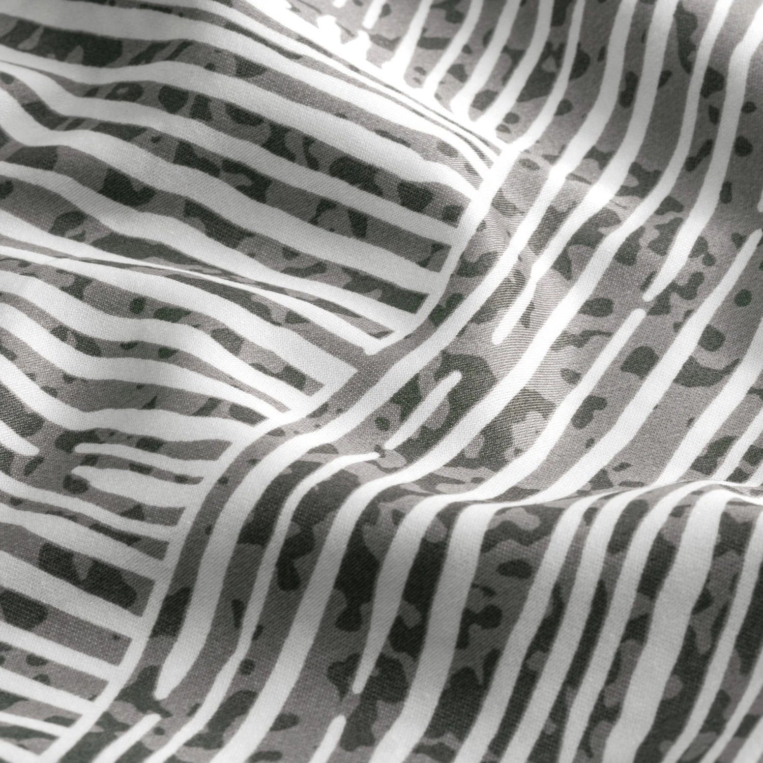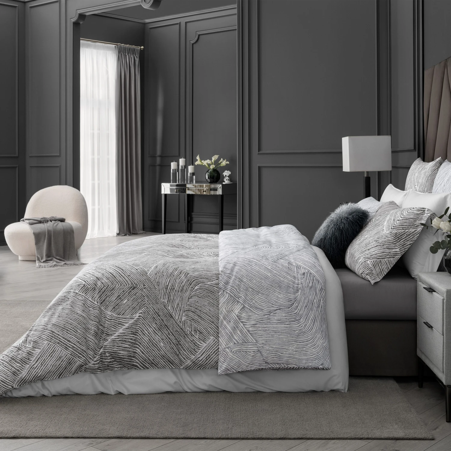 Ferrante impresses with its unusual animalistic design and striking contrasts. There are only two colors – grey and white. The duvet cover is double-sided, the shades change to lighter, smoky-grey ones on the reverse side. Complex interlacing stripes of a monochrome ornament resemble a stylized pattern of striped zebra skin.