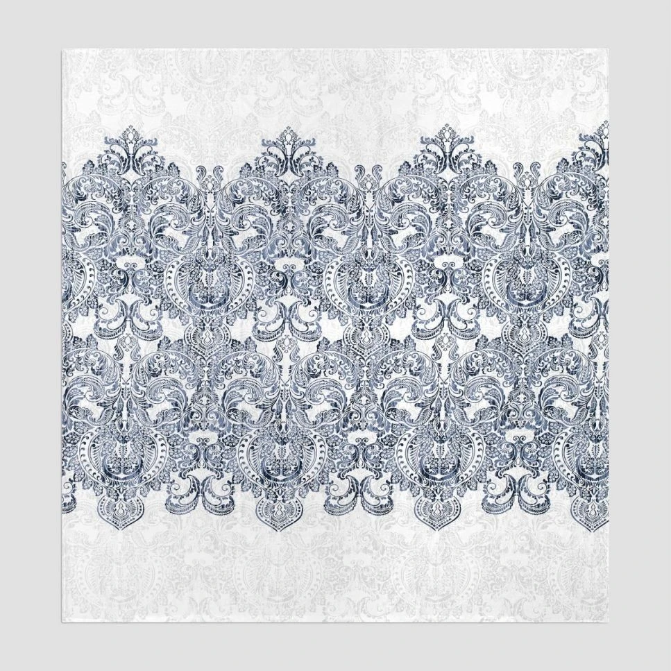 The lines of the classic damasc ornament, made in noble shades of rich blue and azure blue, form ornate openwork weaves. The same ornament in light grey is repeated on a white background of linen, like a subtle shadow or reflection.