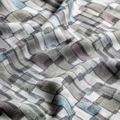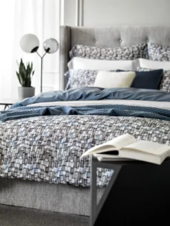 Gilbert bed linen is made in a restrained color palette. The set is decorated with an original print in watercolor technique with its characteristic blurring of contours. Mixing different colors of paint on the fabric creates a beautiful iridescence. The range of these color highlights is very deep, with complex combinations of shades from blue to green, from gold to wine, as if the colored glass pieces of a kaleidoscope were scattered. The noble steel-blue color of the sheet and the back of the duvet cover is the background that sets off the mosaic pattern.