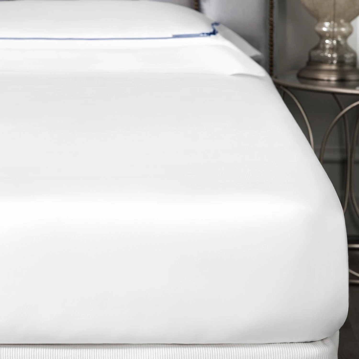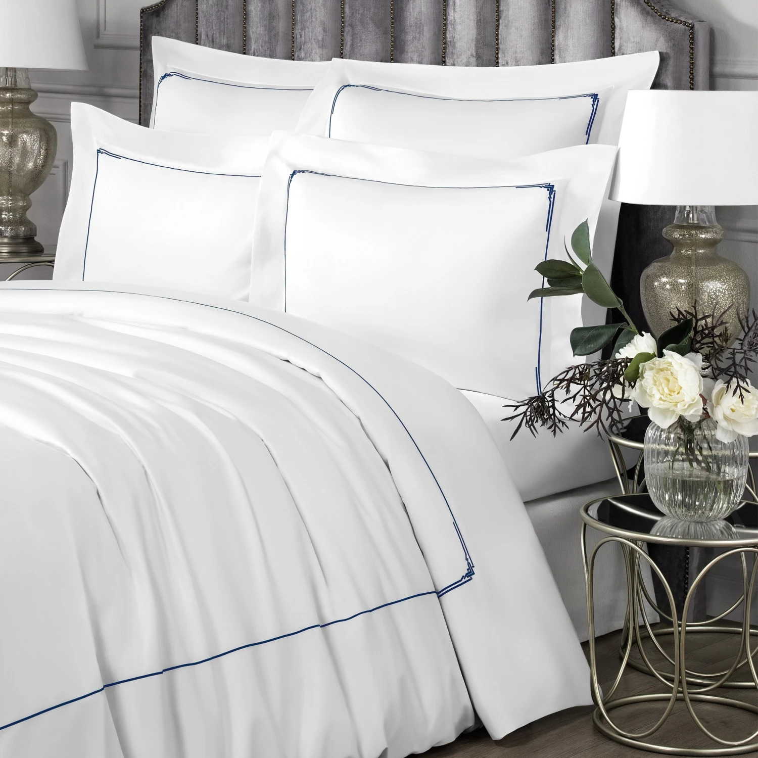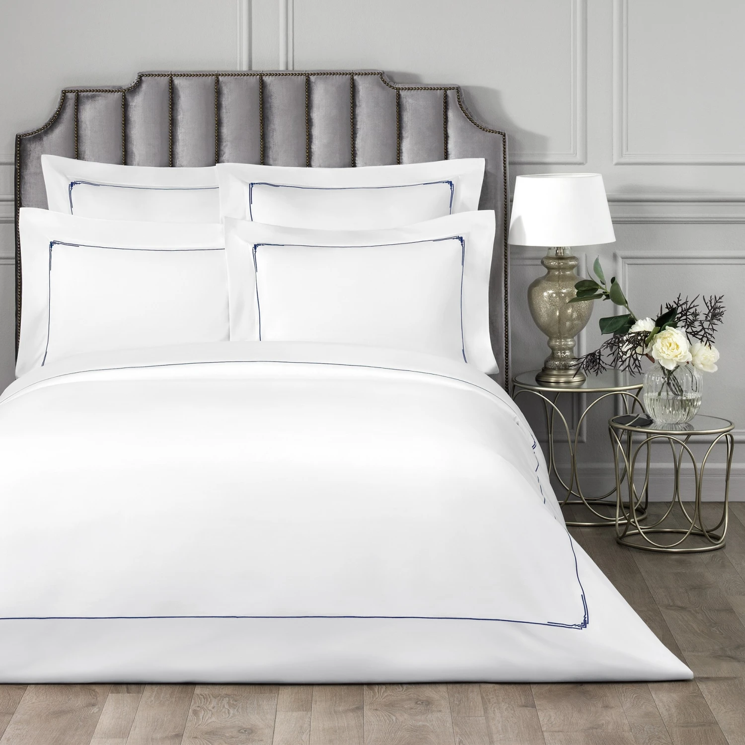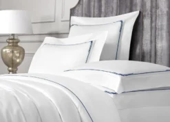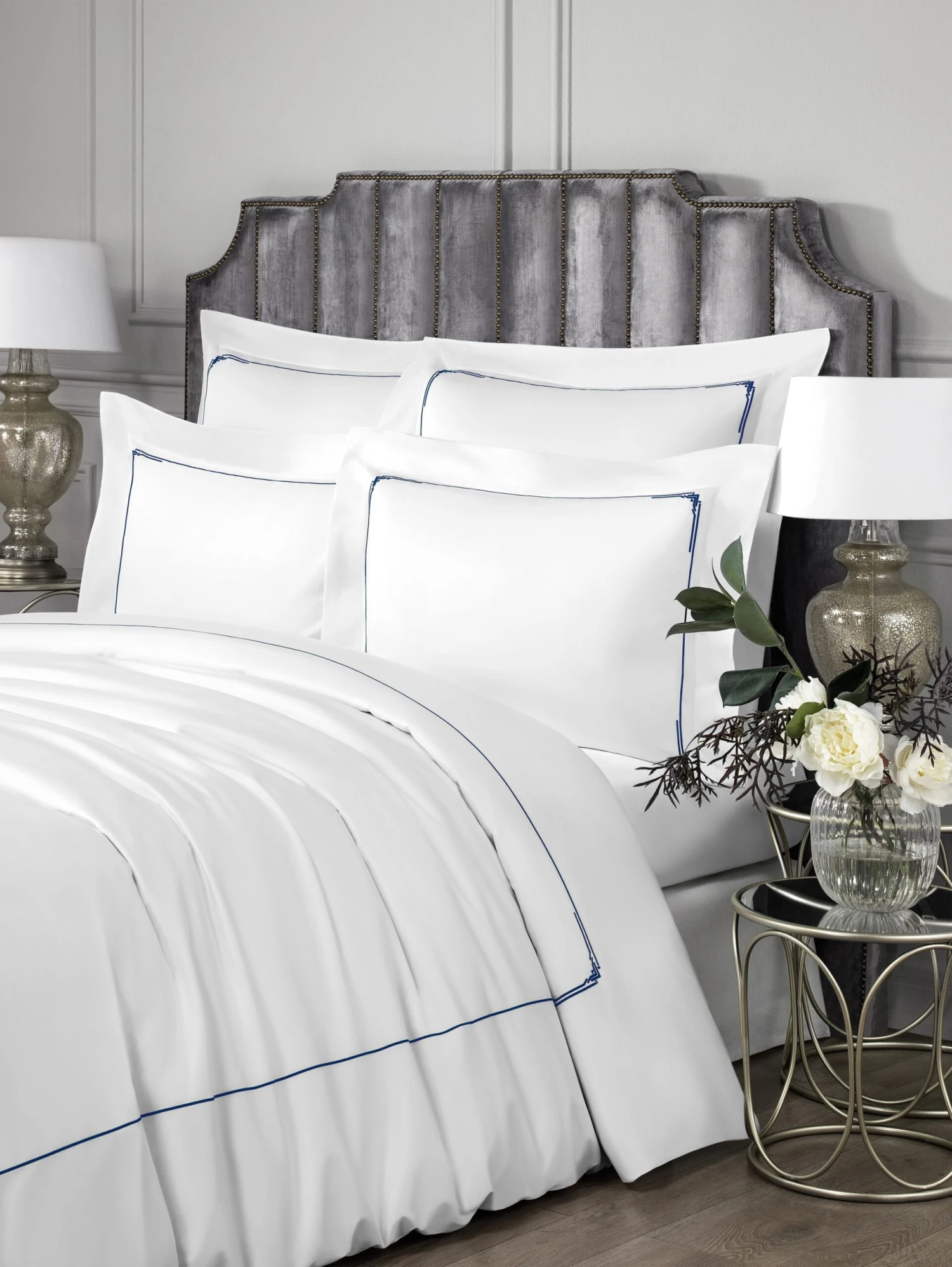 Snow-white Jasper bed linen is decorated only with elegant embroidery of a contrasting blue shade, which decorates the pillowcases and duvet cover around the perimeter and stands out beautifully against the white background of the fabric. The intricate framing of the corners of the duvet cover and pillowcases in this model resembles monogram-embroidered bed linen in the estates of the European aristocracy. The ‘Jasper’ set can be turned into a unique piece of home textiles by decorating it with a personal monogram embroidered on an individual project. Bed linen is made of fine high-density cotton-satin, a very beautiful, pleasant to the touch fabric with a silky Shine. Soft cotton-satin double mercerization is highly hygienic and easy to care for.