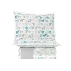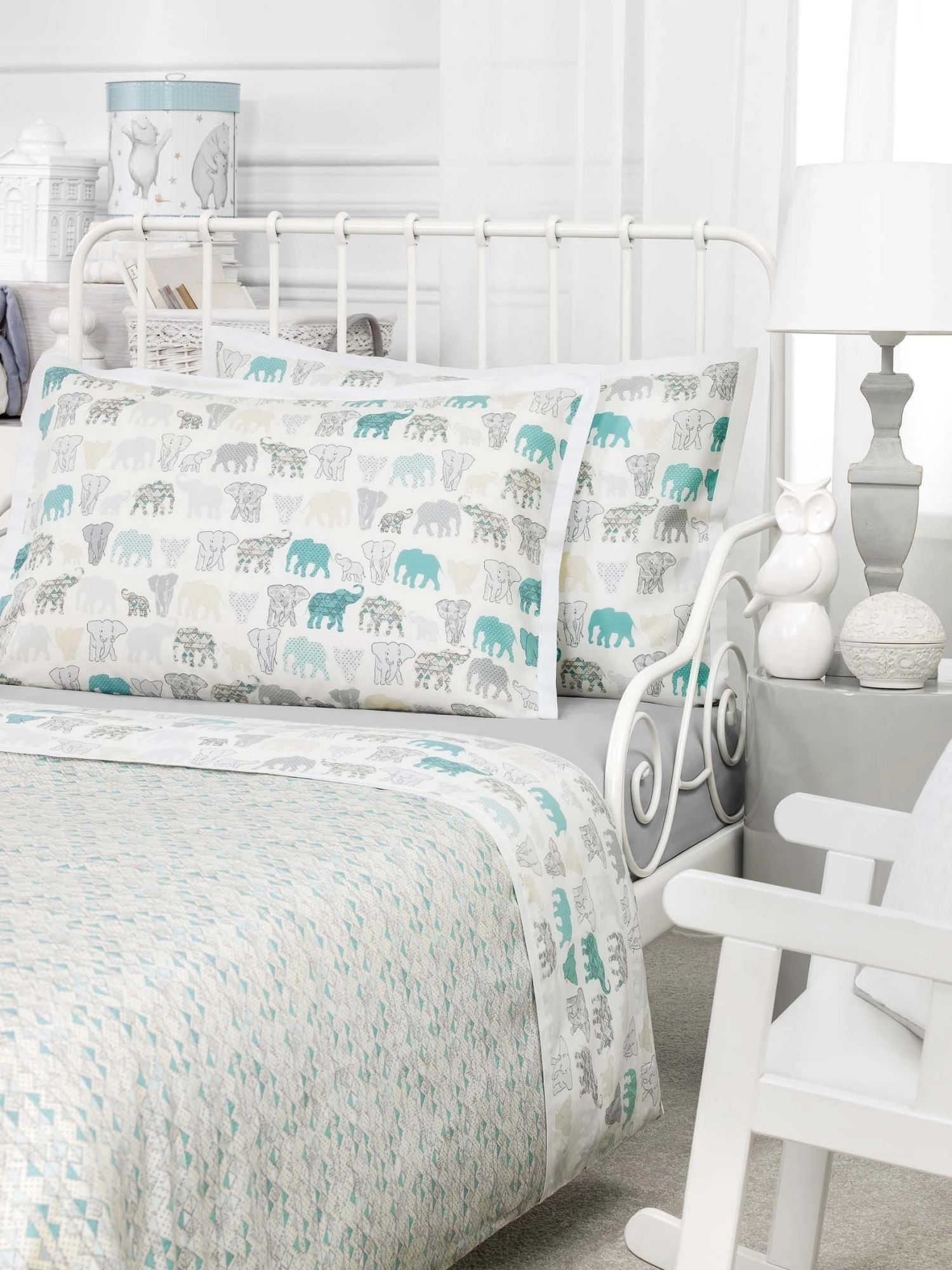 The cold range of colors looks refined and will appeal to those who deny any fussiness and a riot of colors, even in children’s underwear sets. The main course of the ornament is inspired by the famous history of the African elephant Jumbo, who became a circus celebrity. This set is two-sided: one side is decorated with stylized images of elephants, the other – a small geometric print in the same shades. Bed linen is made of cotton-satin, beautiful, soft and pleasant to the touch material with a characteristic silky sheen. Fabric with satin weave threads will not cause trouble in the care, the colors of linen will not fade even after numerous washings.