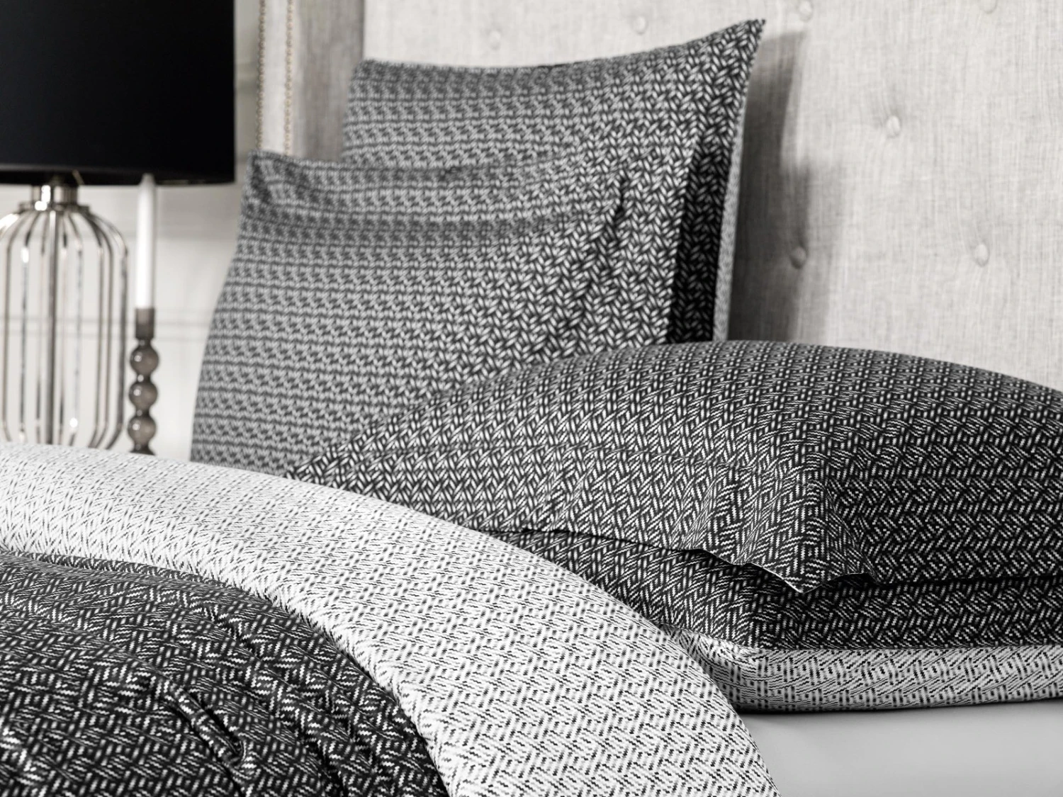 ‘Kennet’ is a strict men’s design and stylish contrast: only two colors are used in the set-rich anthracite and white. The small geometric print on the linen fabric resembles an original canvas woven from ribbons. The set is double-sided: the monochrome pattern is mirrored on the back of the duvet cover and pillowcases.