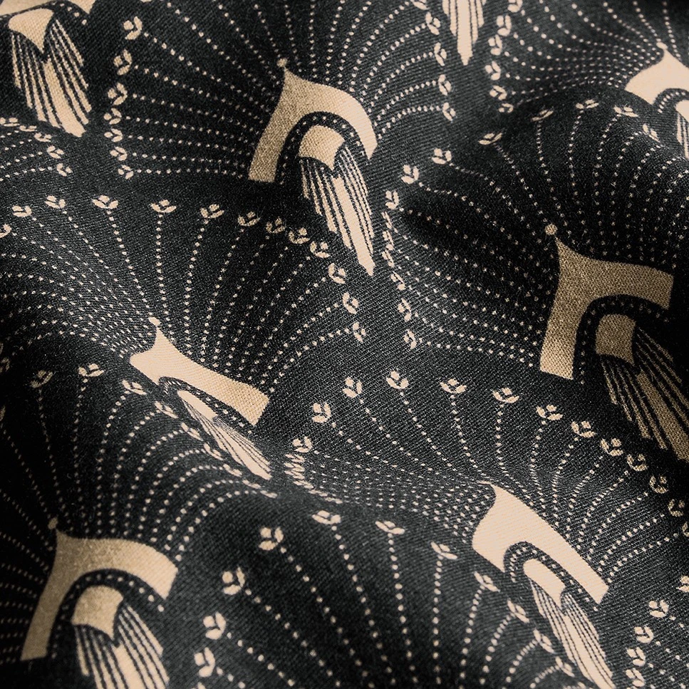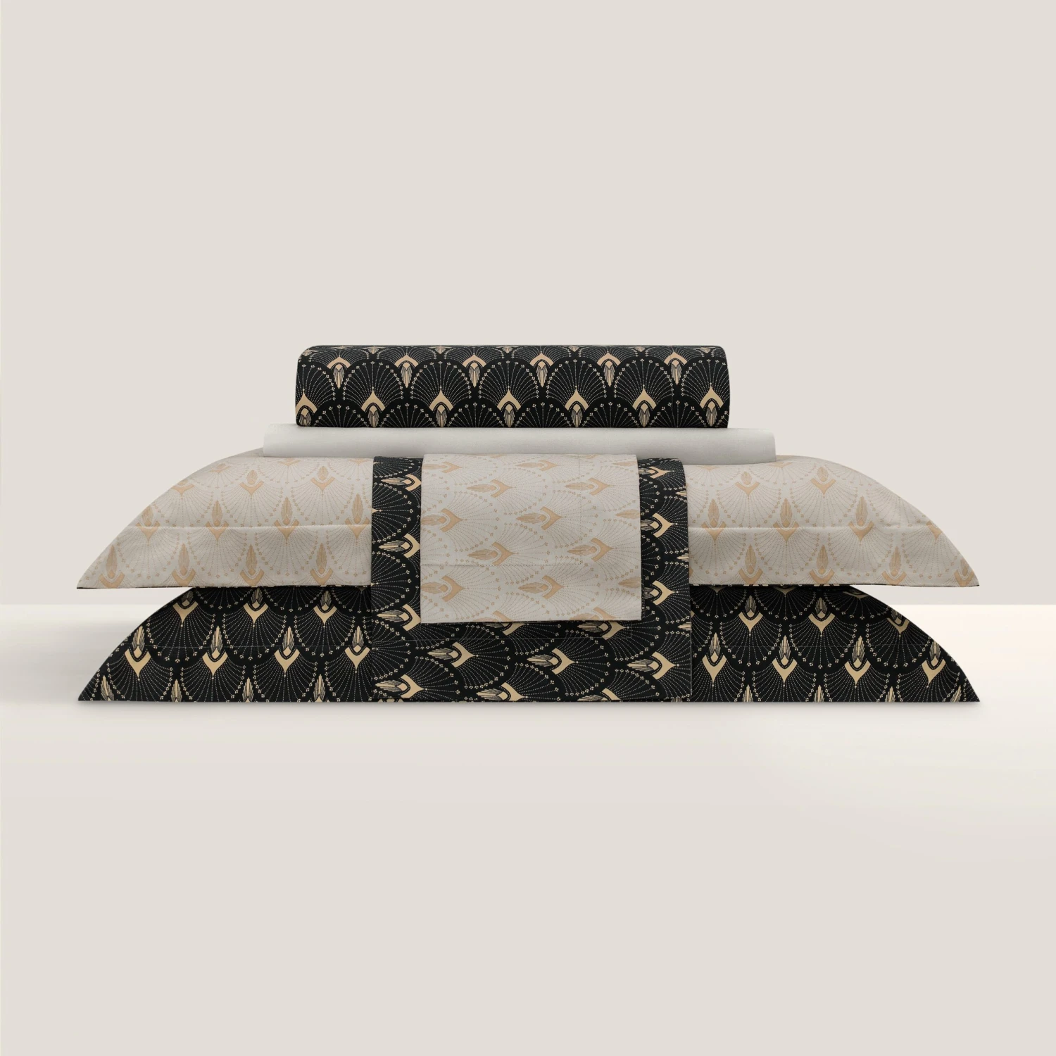 The strict and stylish gold ornament on black fabric is a reference to the luxurious Art Deco era with its geometry of lines and shapes. The characteristic colors of this style are gold, black, silver and make up the three colors of the set, effectively contrasting with each other.