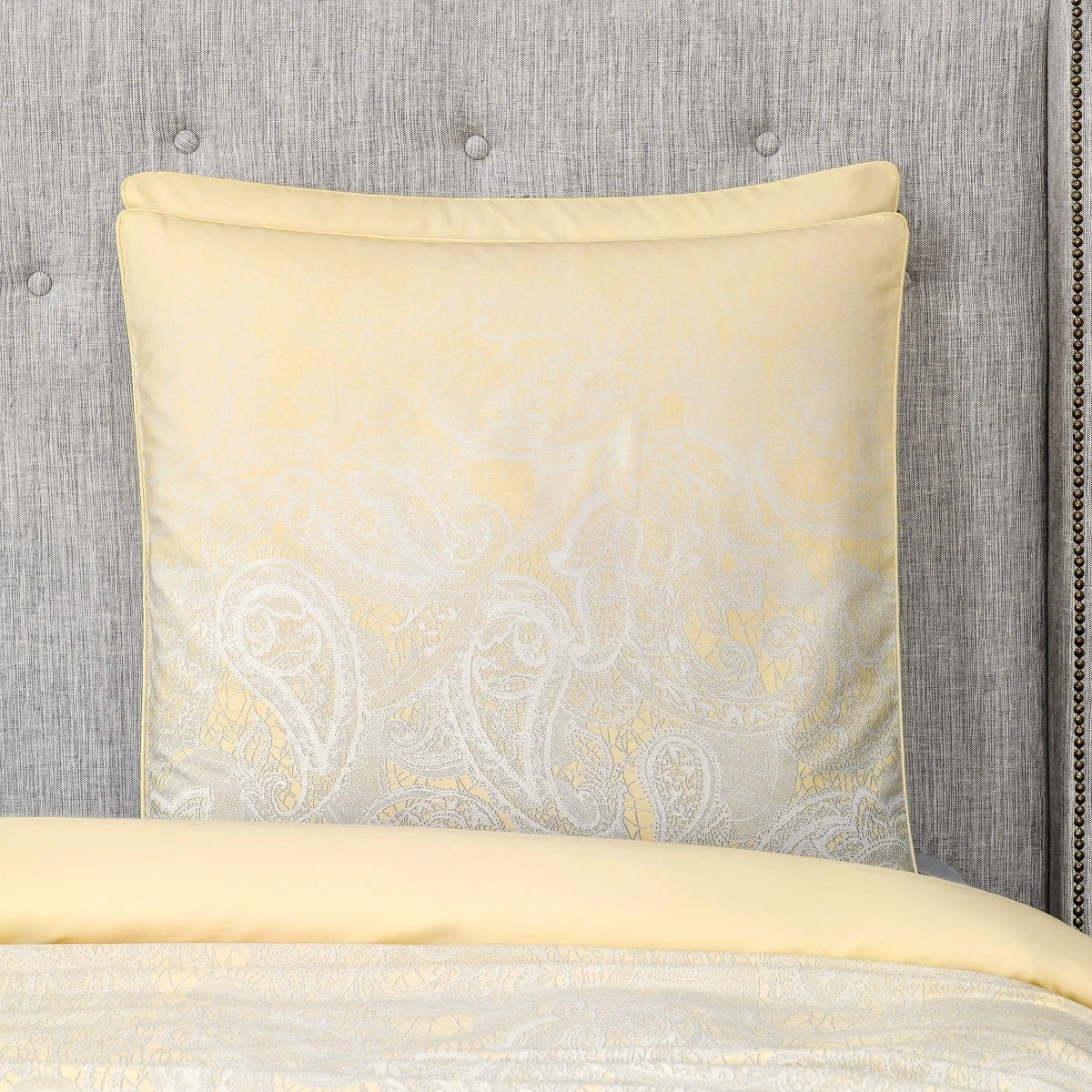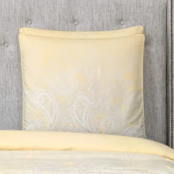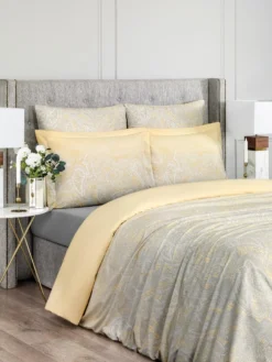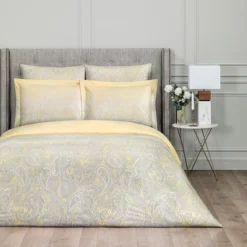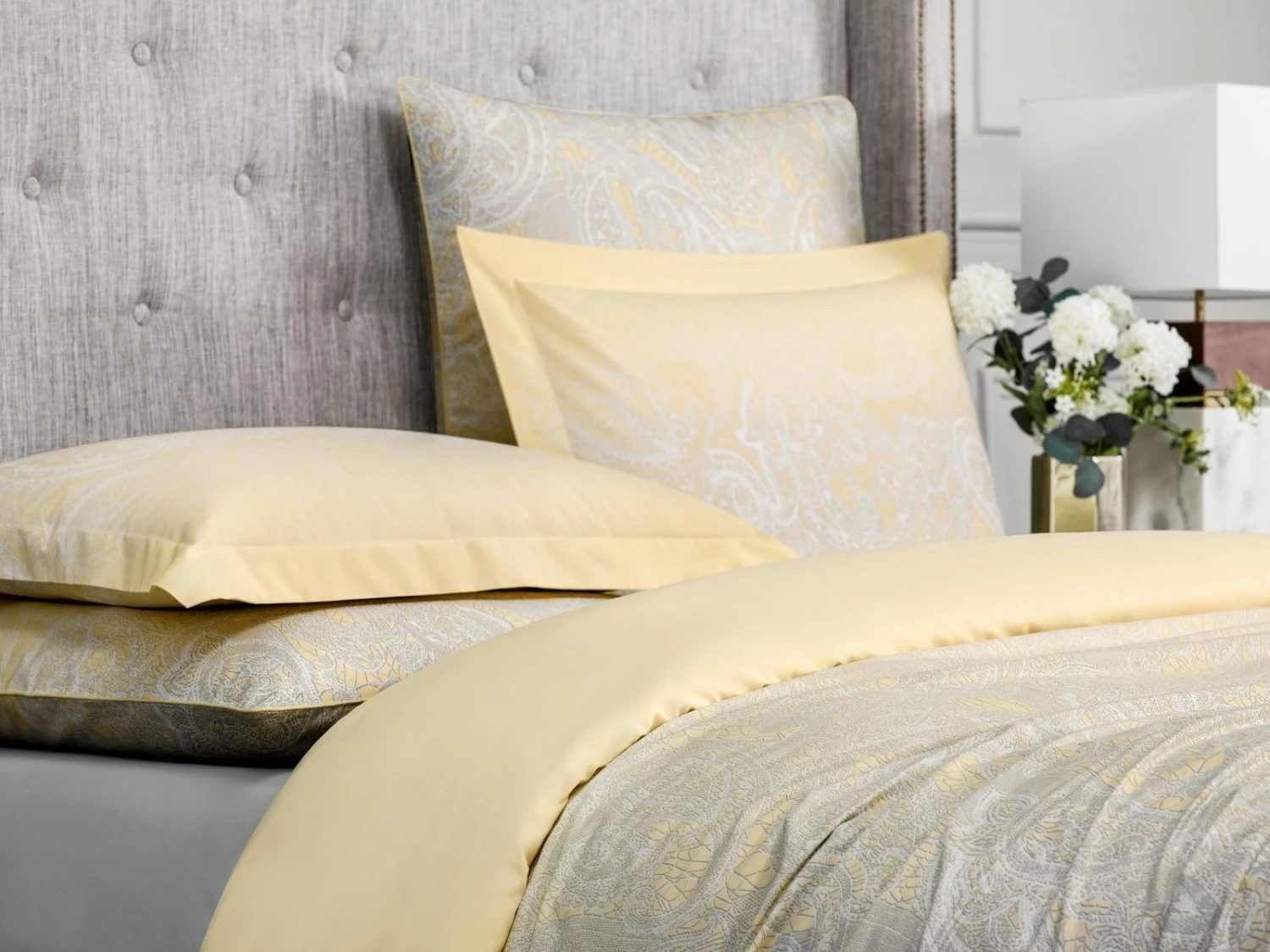 Against the soft light yellow background of the fabric ‘Margaret’ stands out the Eastern pattern of Paisley ash-gray shade. The elegant, finely drawn lines of this classic ornament resemble silver-pearl French lace, which is embroidered on the fabric of the duvet cover and pillowcases. The reverse side of the duvet cover is plain, which allows you to change the design of bed linen and the situation in the bedroom, depending on the mood.