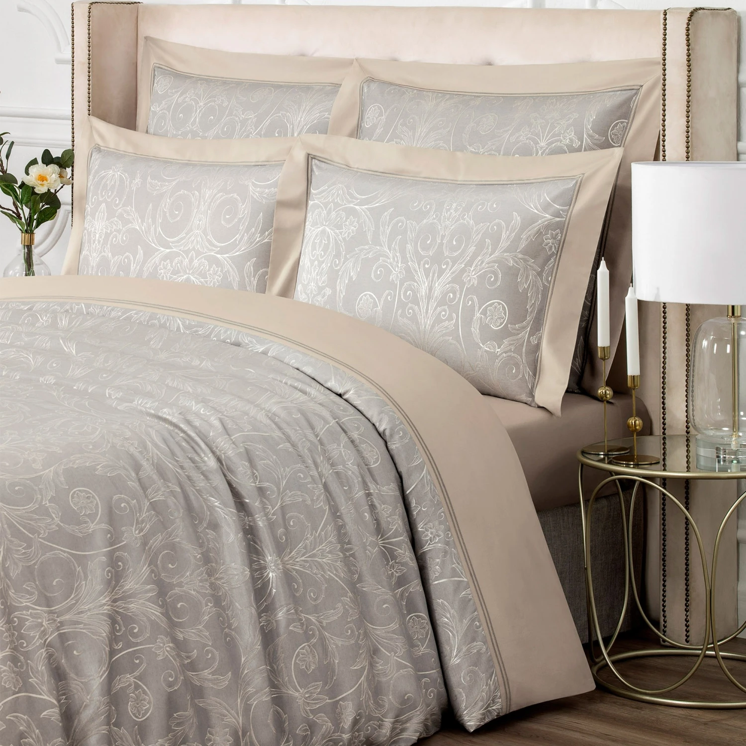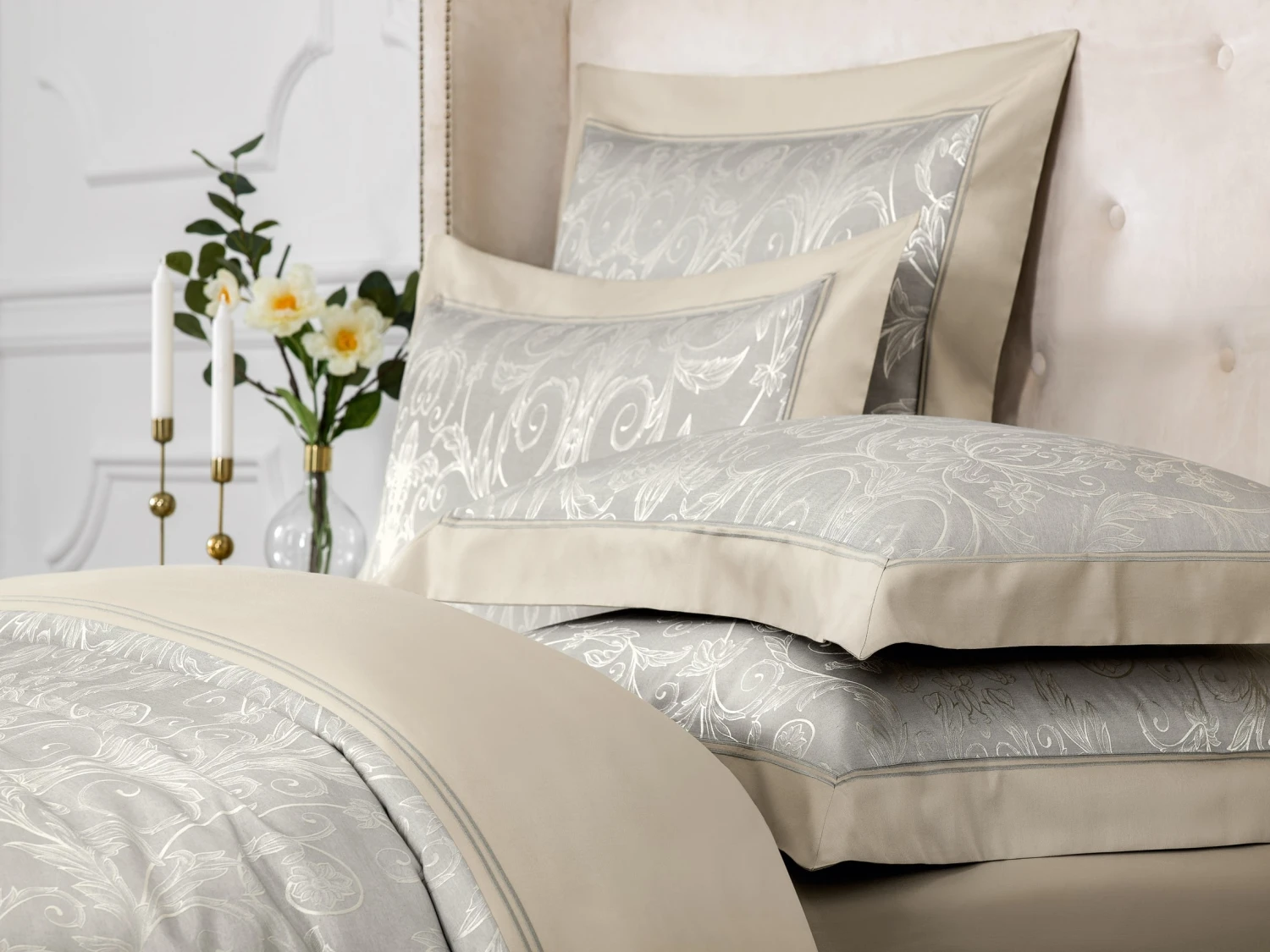 The fine weave of classic ornament, the famous Damascus made on the jacquard fabric of linen, fascinating in its subtlety and gold glitter. Wide monochrome borders on pillowcases cast soft gold and decorate exquisite jacquard ornament like a frame that frames a beautiful picture. This luxury bed linen is made of high-quality long-fiber cotton combined with viscose.