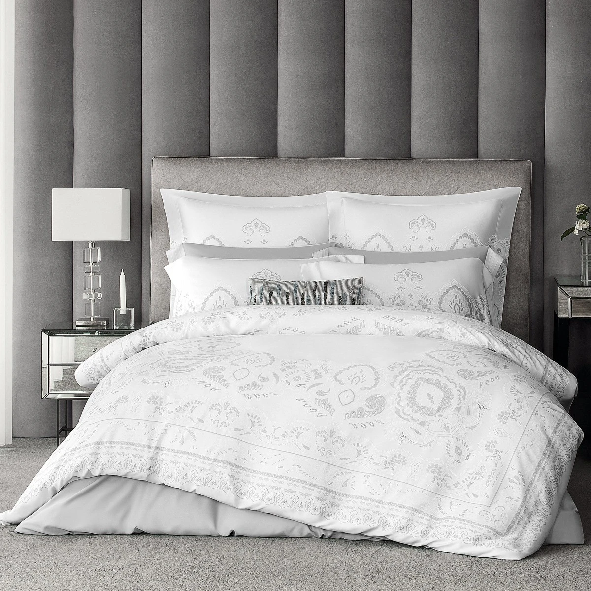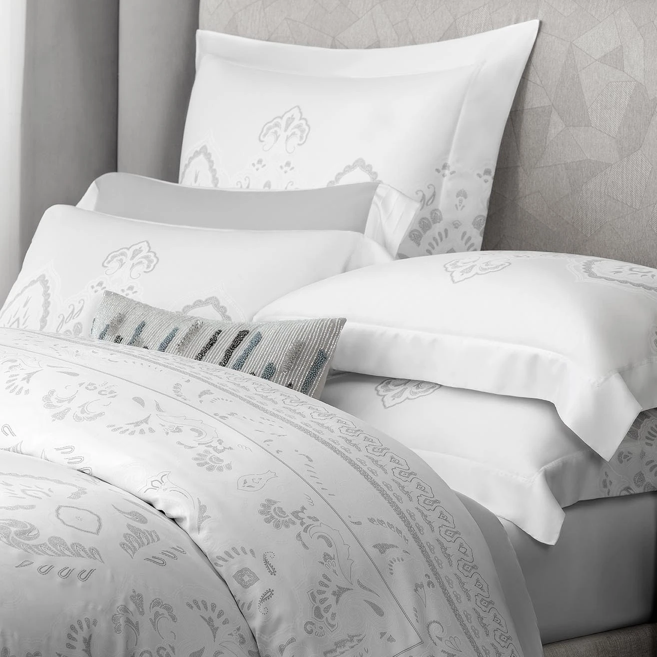 Creating the print of this bedding set Togas designers combined the graceful openwork of French Chantilly lace with the ornate oriental ornament and the airiness with the depth of oriental philosophy.
