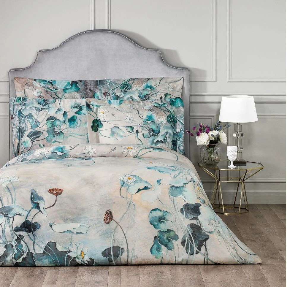 Its stems come out of the ground and live in water, the flowers are filled with the fire of sunlight and breathe air. Lotus is a symbol of life, divine beauty, purity and craving for light. Set ‘Lotus’ is made in complex, exquisite shades: play turquoise tones on large leaves and stems of this plant and snow-white Lotus petals effectively stand out on a smoky background of bed linen. The ornament, as if covered with a haze of morning fog, resembles a drawing of dry pastel with its characteristic soft strokes. This set is made of soft, silky, pleasant to the touch bamboo fiber, which has an amazing ability to regulate the temperature. It will be comfortable to sleep in the cold season, and in hot weather silky touch of fabric will give a light cool.