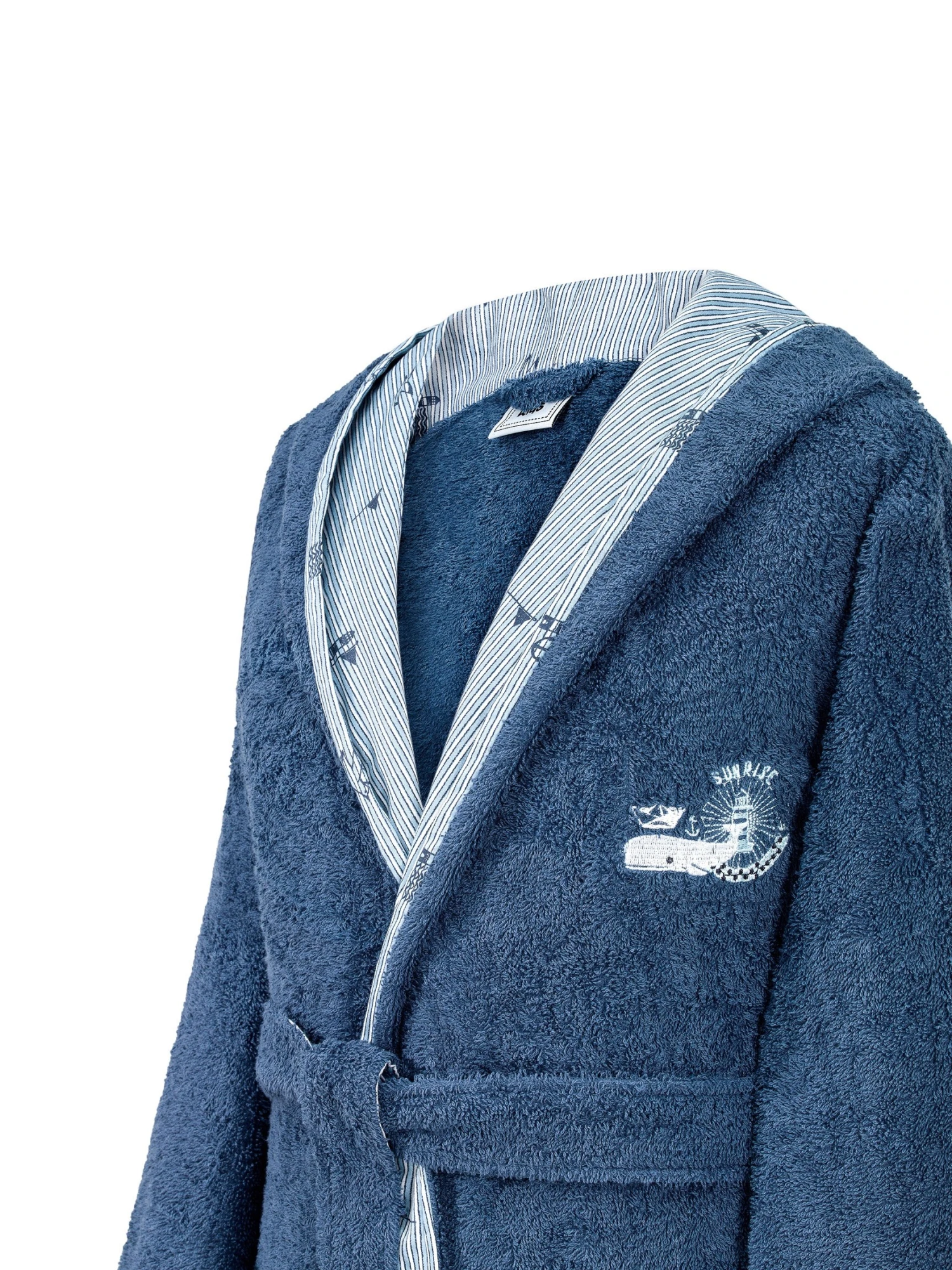 The cut of this model is a traditional kimono with pockets and a belt, the sleeves, and collar of the product are decorated with a striped blue and white edging.