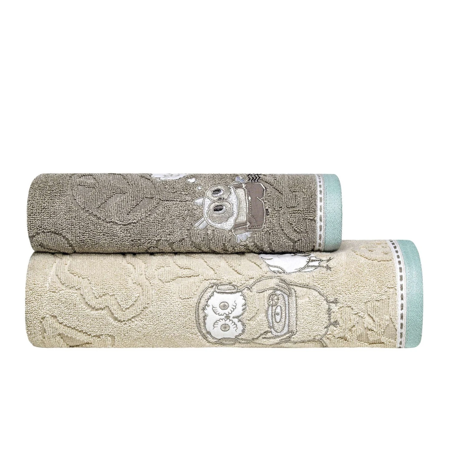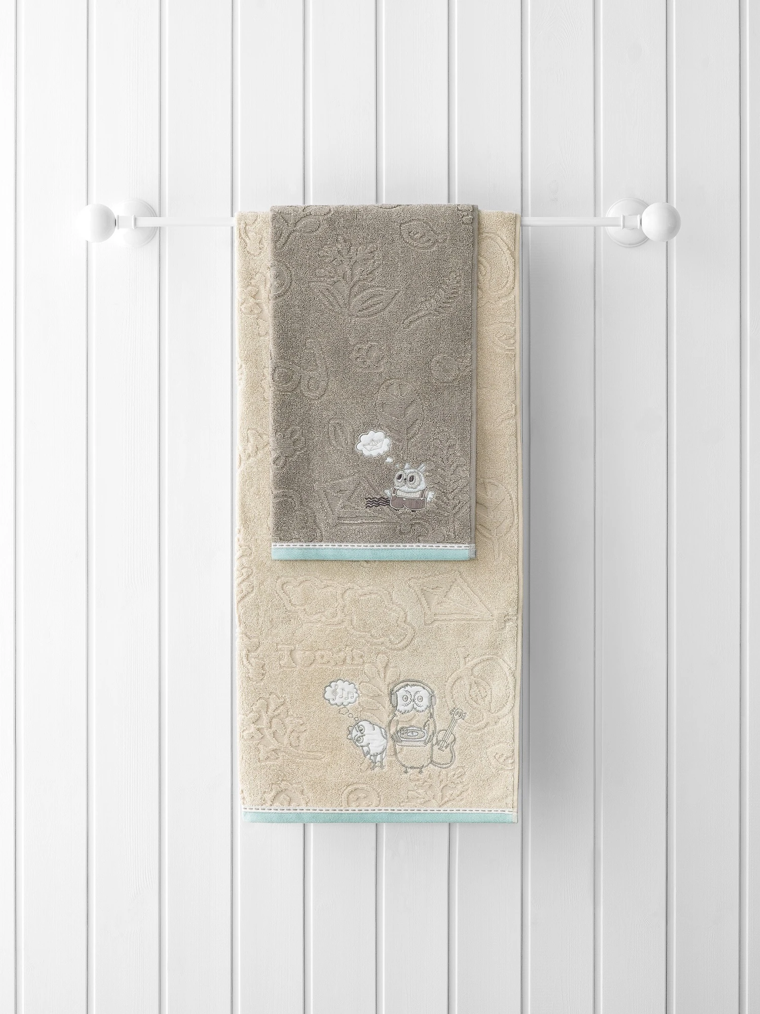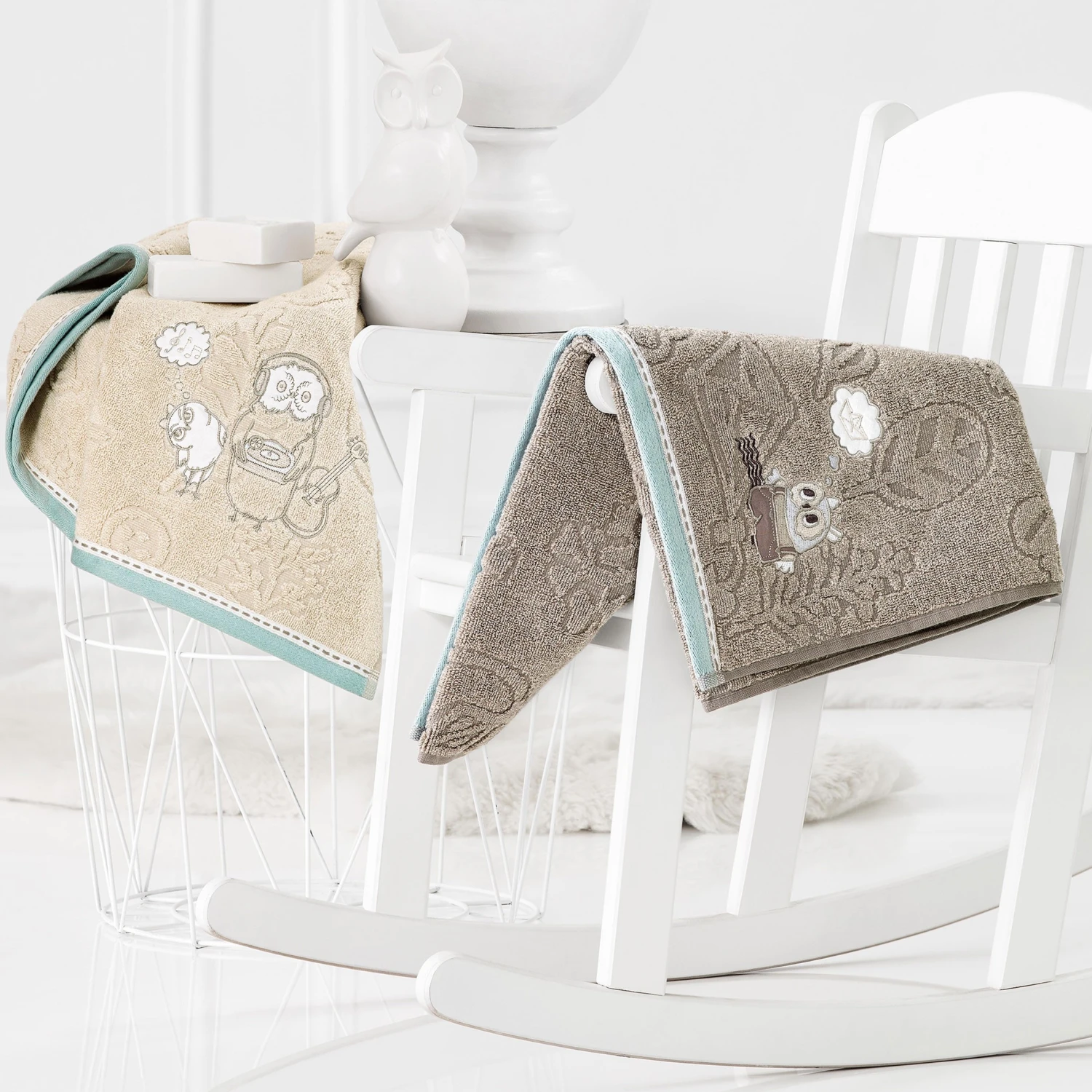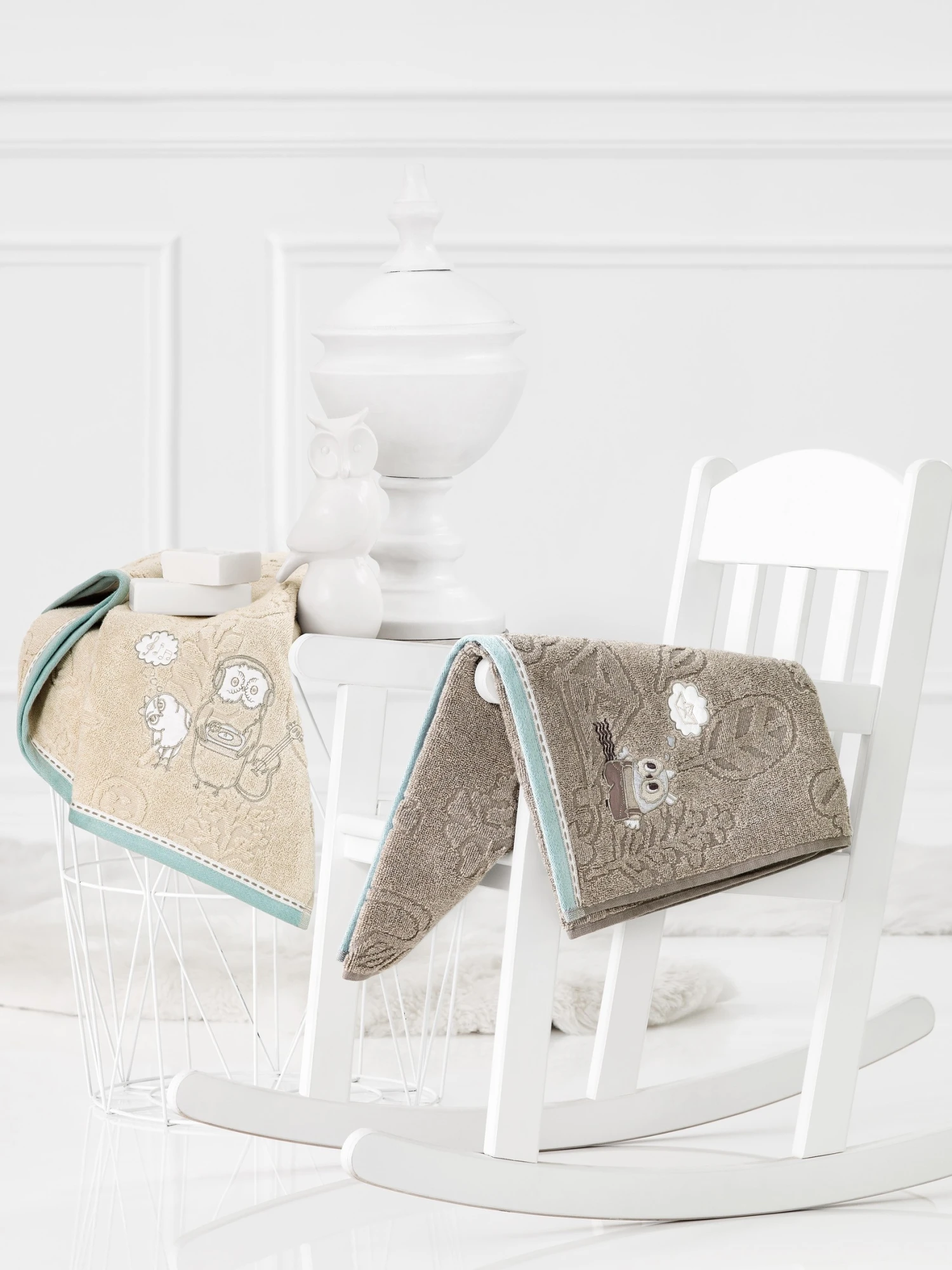 The line ‘Cheeky owls’ includes two Terry products: a large bath towel of beige color and a small towel for the face of a coffee shade. The material of the products is high quality combed cotton, Terry cloth with single loops of loosely twisted threads is very soft and lush, perfectly absorbs moisture.