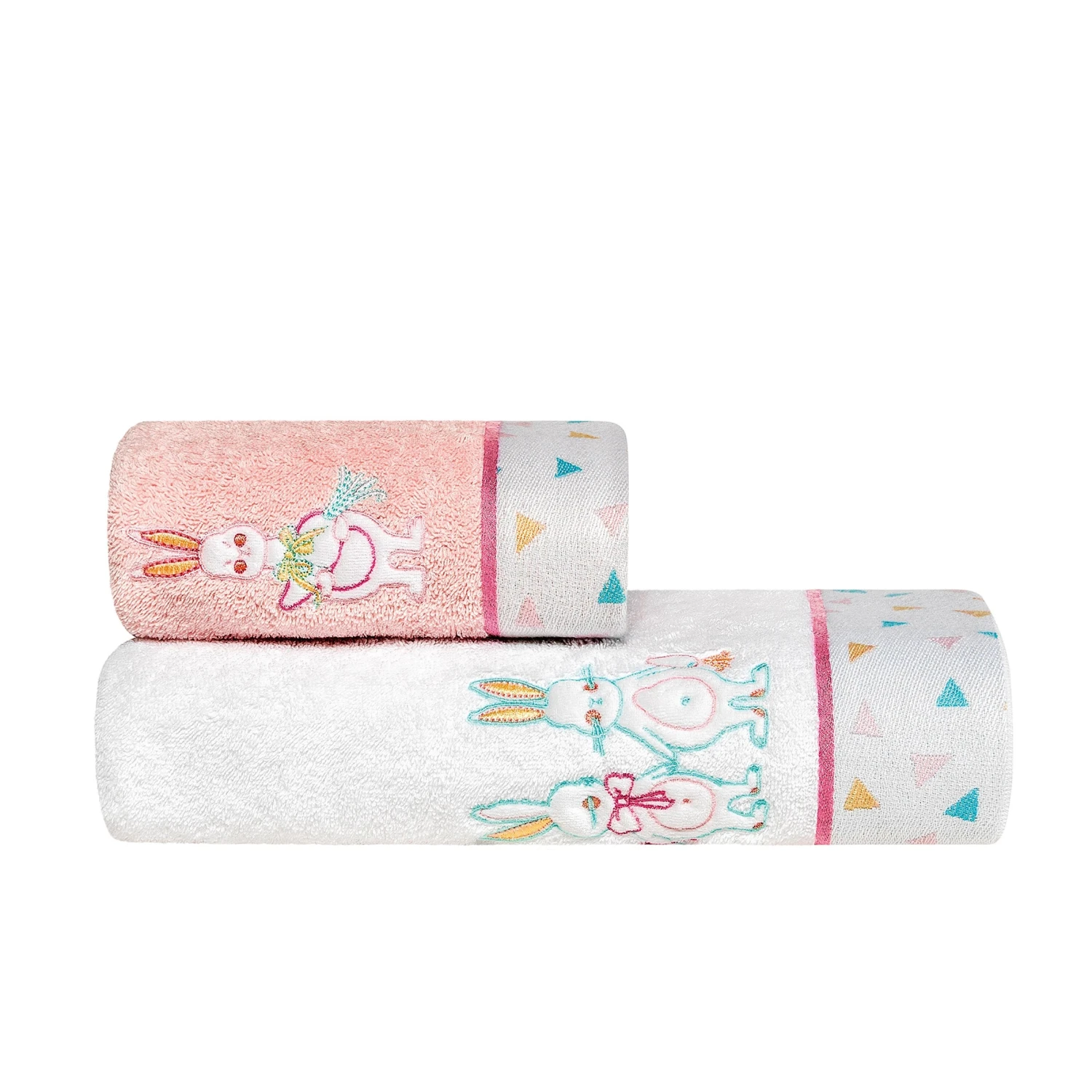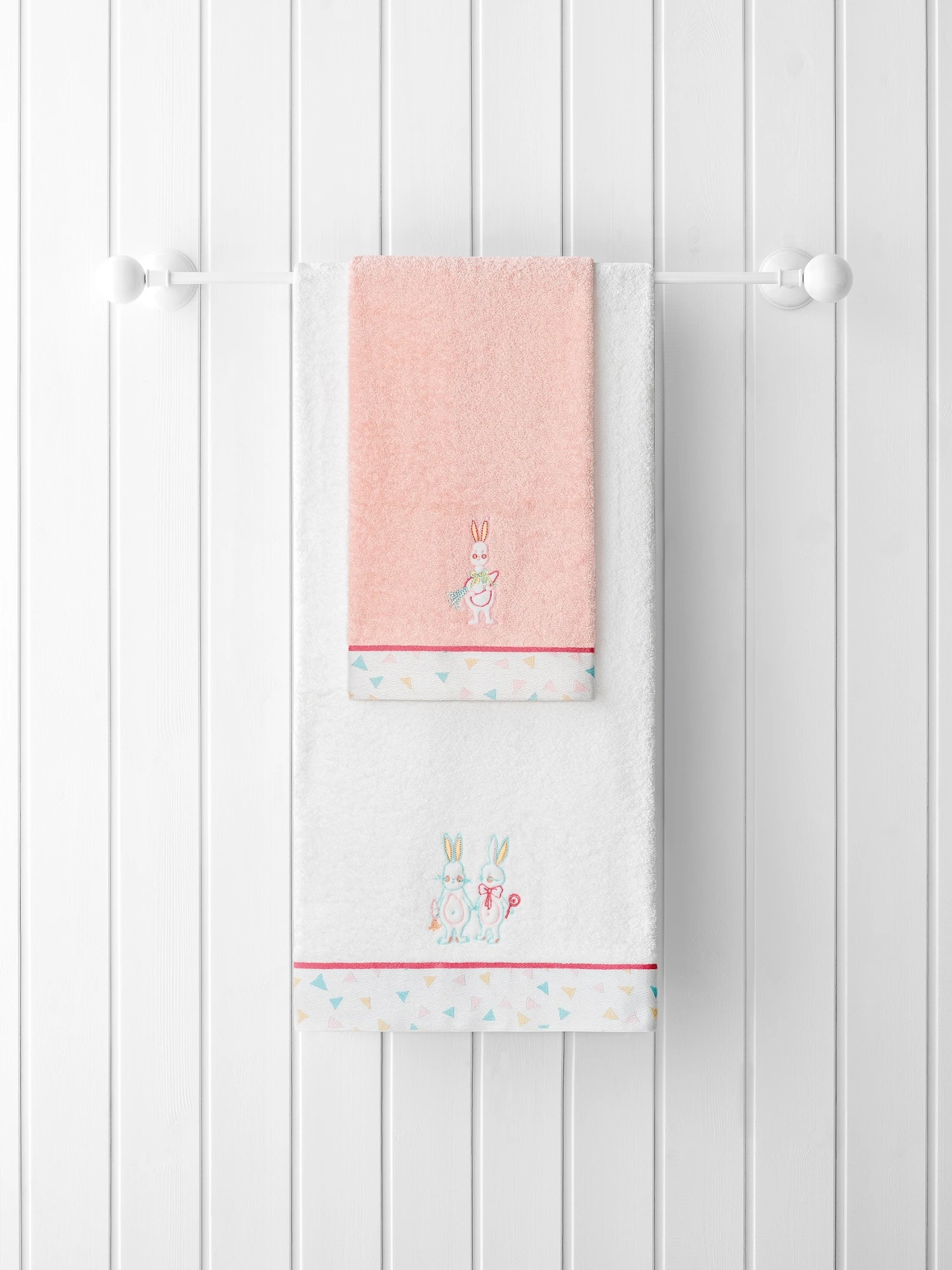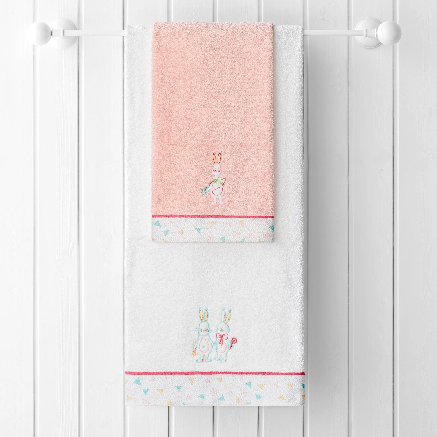 A large white bath towel and a small pink version for the face are decorated with touching embroidery depicting a family of cute bunnies.