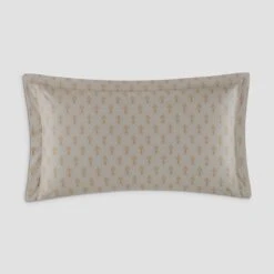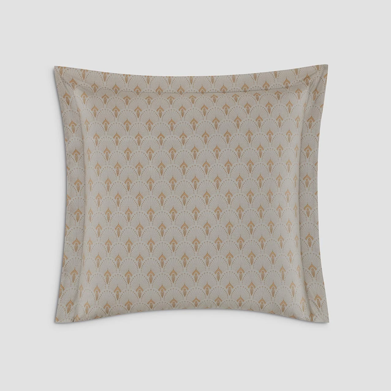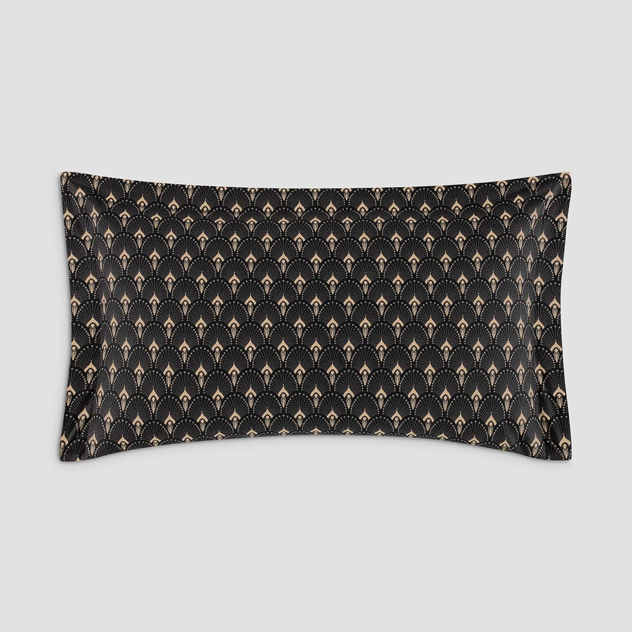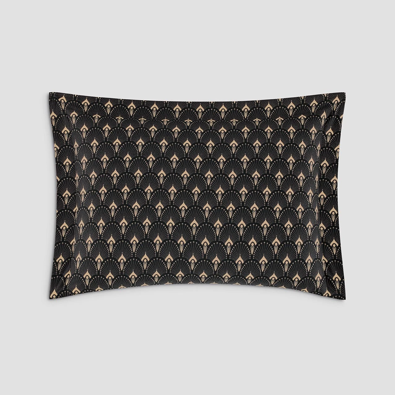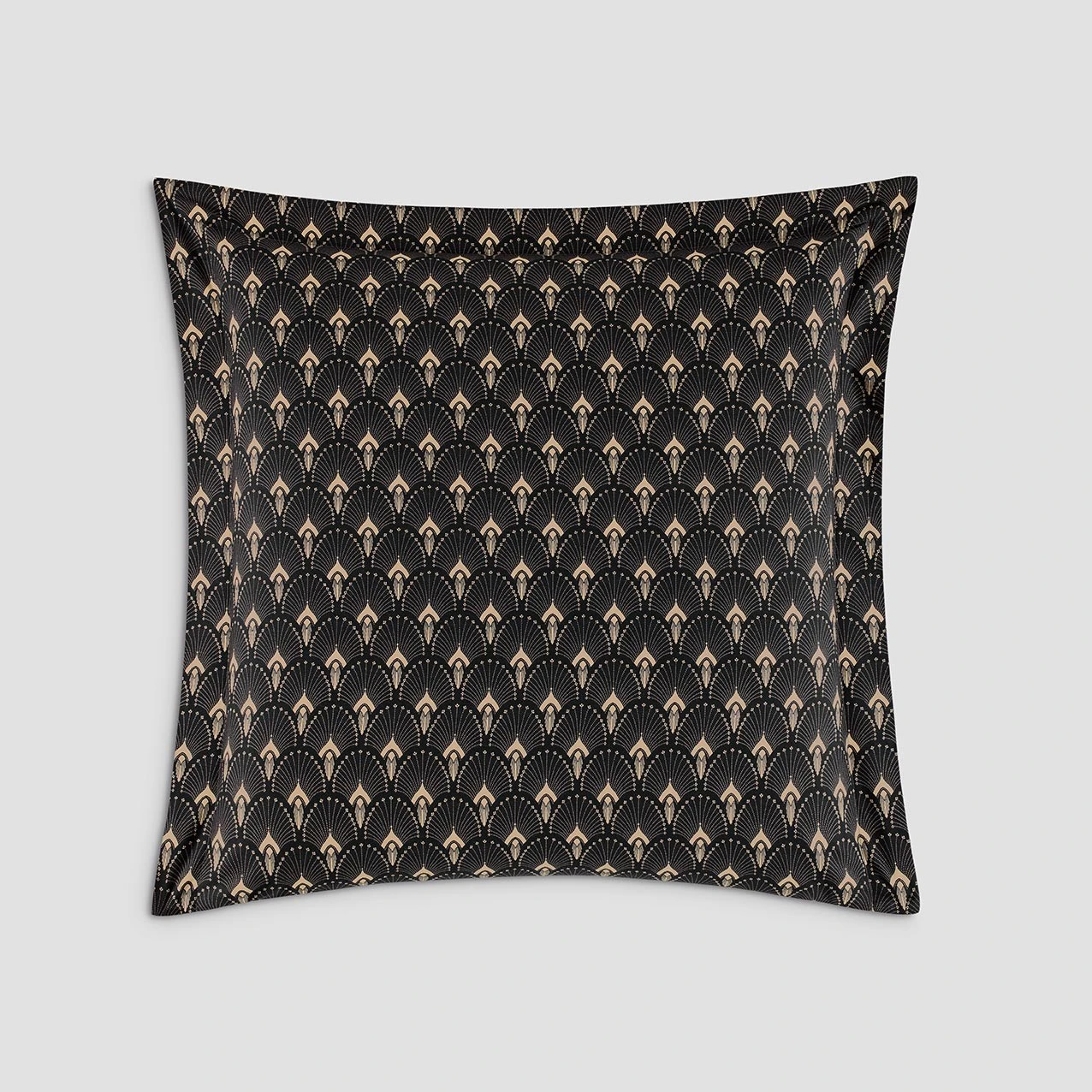 The smart and stylish gold ornament on the black fabric is a reference to the luxurious Art Deco era with its geometry of lines and shapes. The distinctive colors of this style – gold, black and silver – make up the three colors of the set, making a gorgeous contrast. The pattern of Lander is a stylized image of an Egyptian palmette representing the rays of the rising sun, one of the most popular Art Deco images. The pillowcase are double-sided and the reverse side repeats the same pattern, but on a silver-gray fabric background.