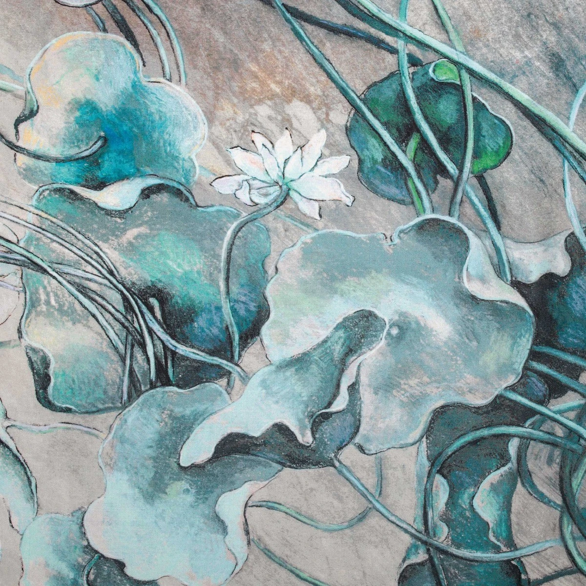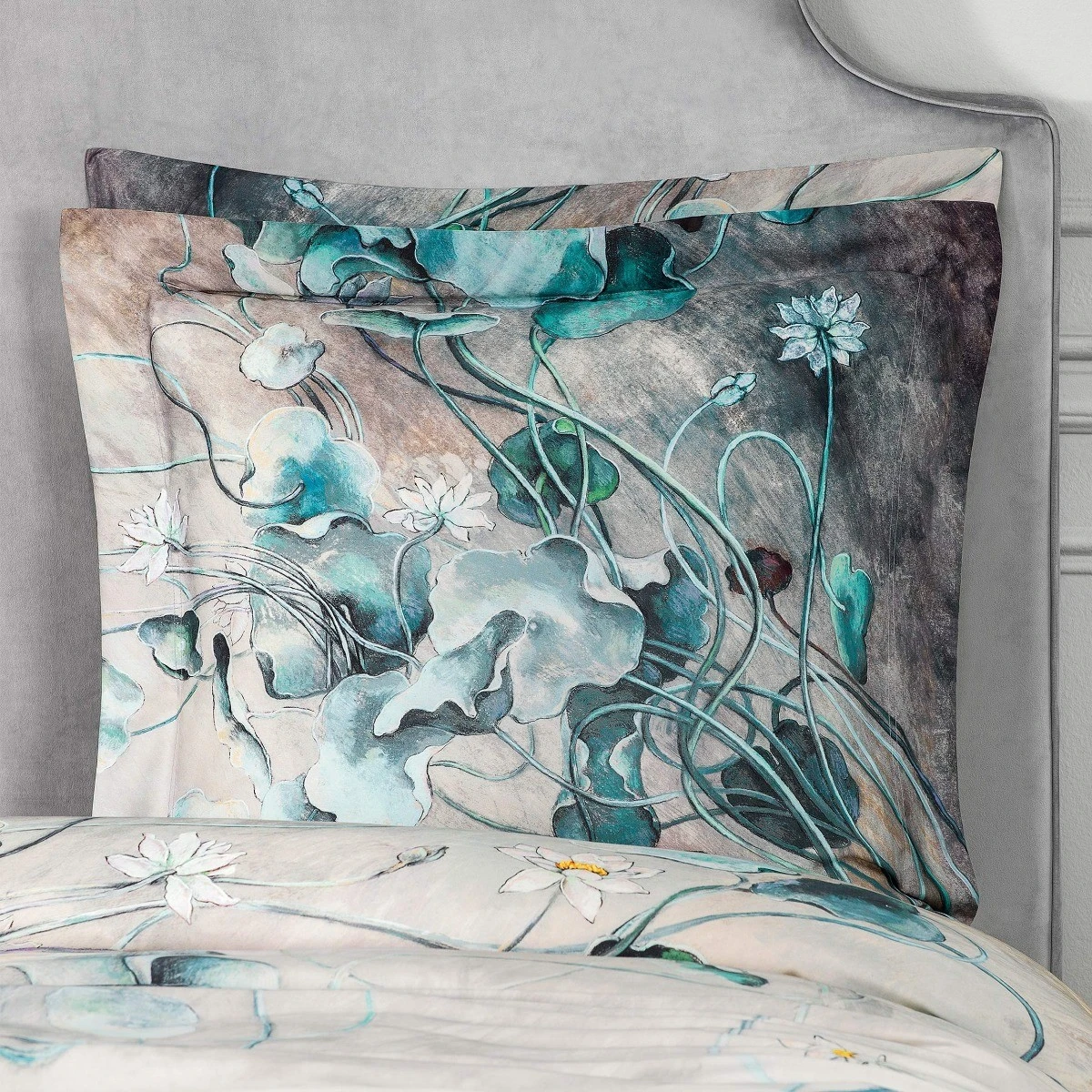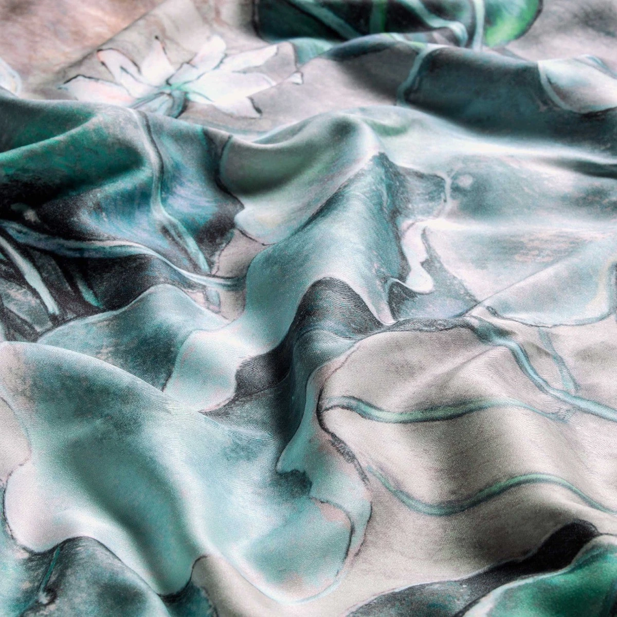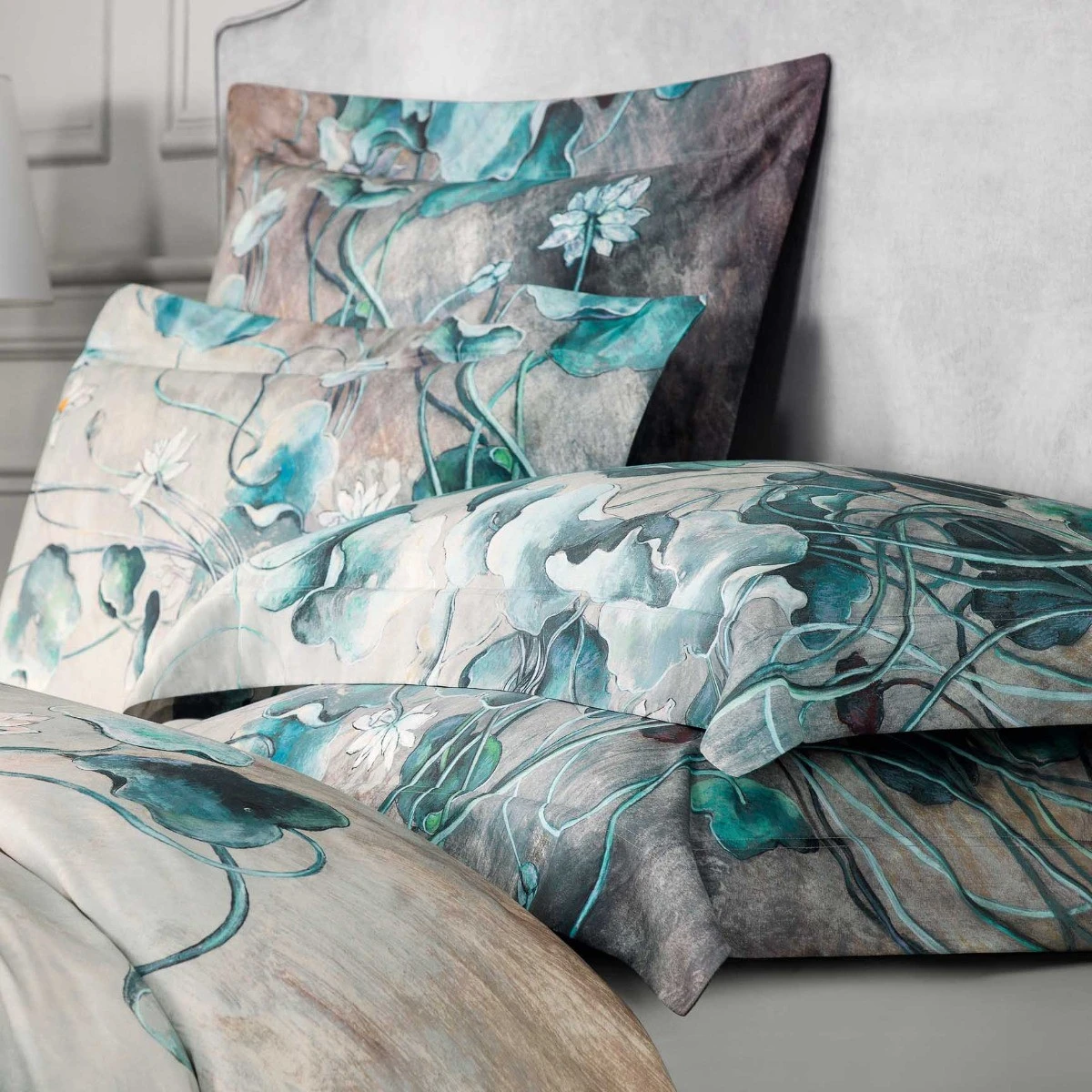 Its stems come out of the ground and live in water, the flowers are filled with the fire of sunlight and breathe air. Lotus is a symbol of life, divine beauty, purity and craving for light. Set ‘Lotus’ is made in complex, exquisite shades: play turquoise tones on large leaves and stems of this plant and snow-white Lotus petals effectively stand out on a smoky background of bed linen. The ornament, as if covered with a haze of morning fog, resembles a drawing of dry pastel with its characteristic soft strokes. This set is made of soft, silky, pleasant to the touch bamboo fiber, which has an amazing ability to regulate the temperature. It will be comfortable to sleep in the cold season, and in hot weather silky touch of fabric will give a light cool.