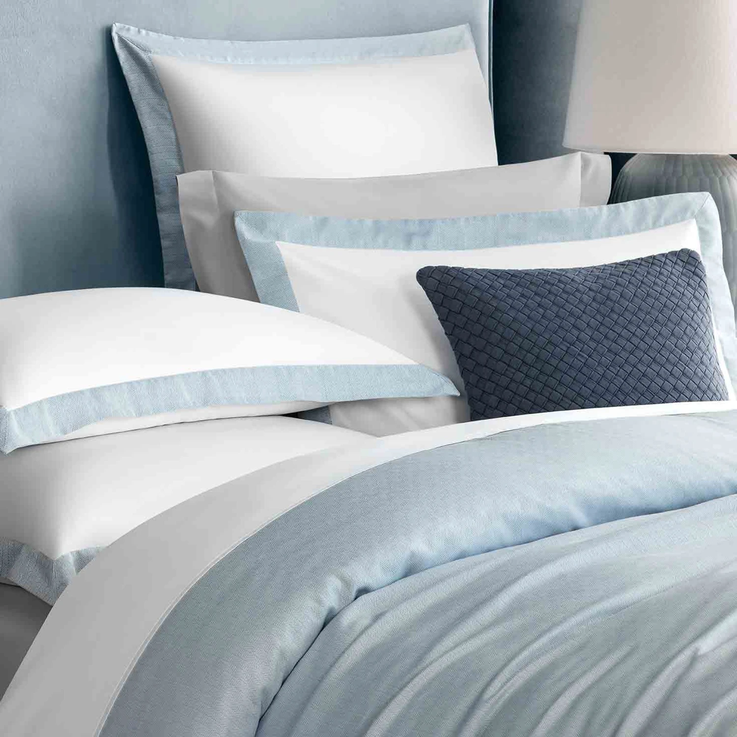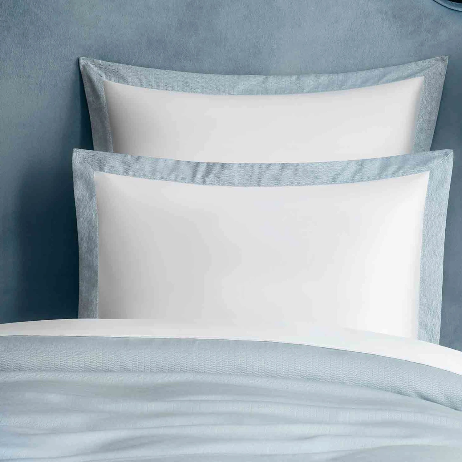 This set combines two different textures. Smooth satin is complemented by a companion material with a jacquard pattern on the front of the duvet cover. A discreet geometric ornament of light blue color attracts attention with a noble relief created on a jacquard loom. The Maestro pillowcases are framed by wide decorative borders with the same geometric elements. An elegant set ‘Maestro’ will decorate any bedroom, this is a premium class bedding.