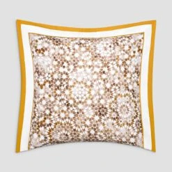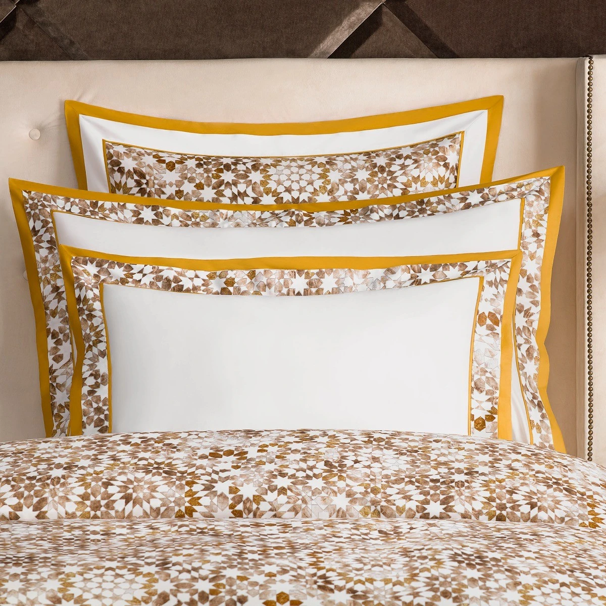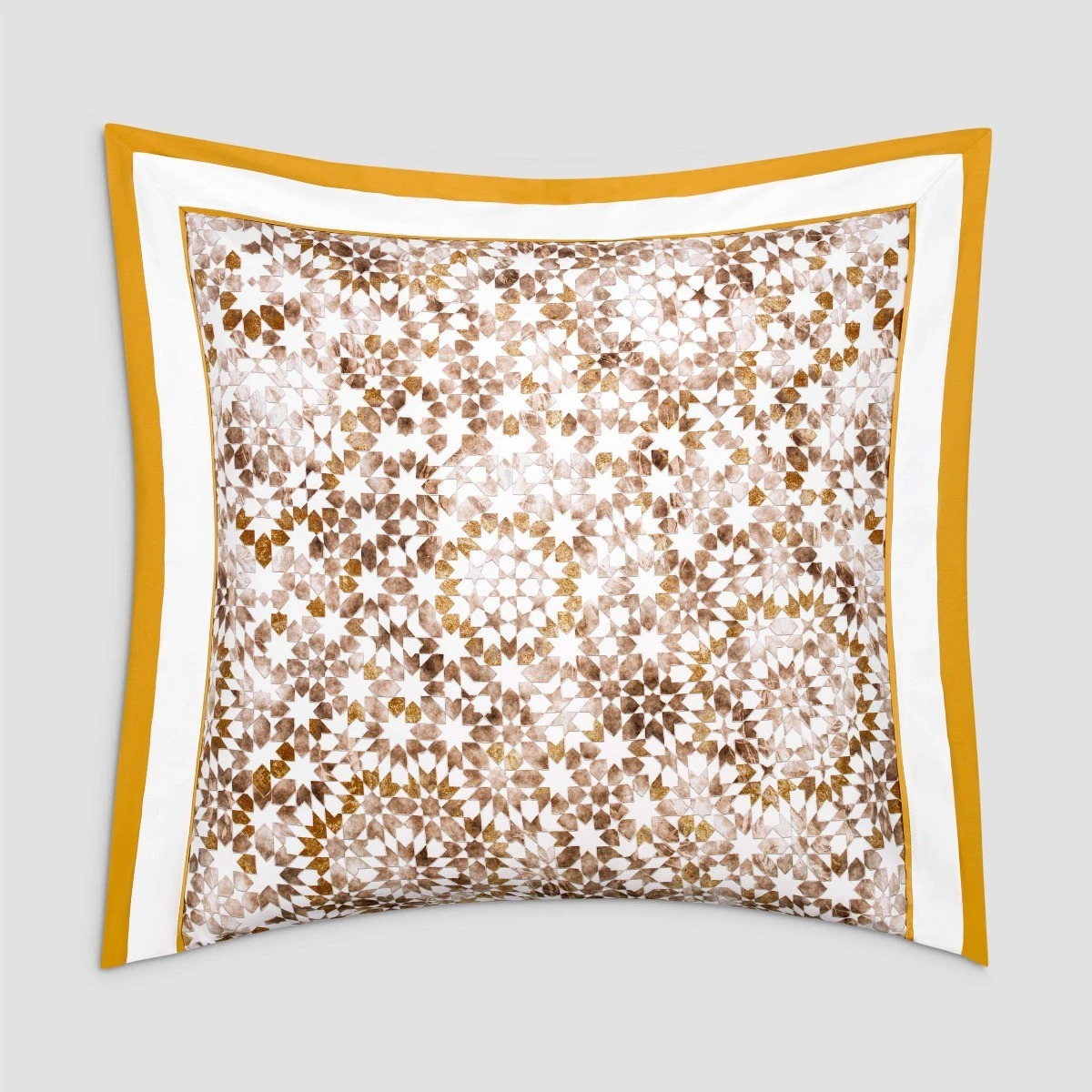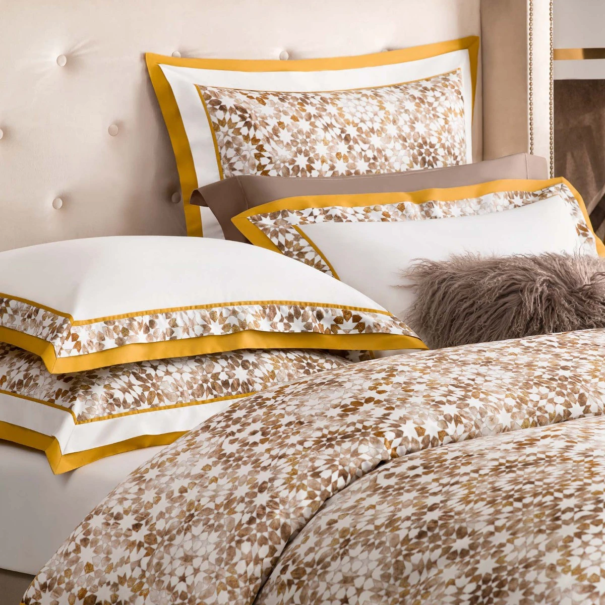 The intricate interweaving of the lines of the ornament on the “Noorim” fabric and its warm golden hues resemble the stylized oriental girih pattern. It expresses the perfection of geometric beauty and is a symbol of the divine principle. The warm palette is the colors of hot sand and hot sun. Pillowcases on the reverse side are monochromatic – bright sunny mustard color. The duvet cover and pillowcases are decorated with double decorative borders. This set looks elegant and effective, it reflects the oriental brightness of colors, symbolism and the philosophical meaning of Islamic ornaments.