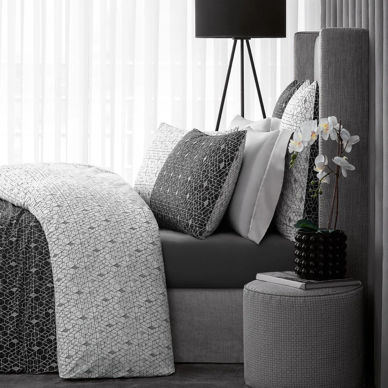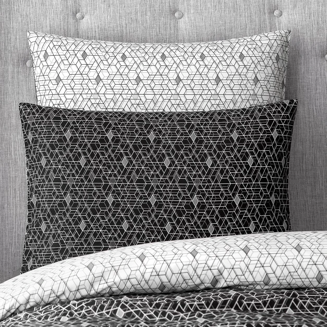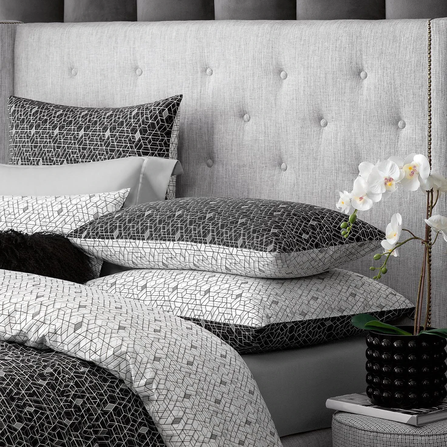 Fans of graphics, geometry and monochrome will appreciate the black-and-white combination and a complex geometric print of Baker fabric. The pattern inversion allows to change the color of pillowcases to the opposite one by flipping the side, and in doing so to make the bedroom lighter and more welcoming or filled with the mysterious blackness, depending on your mood.