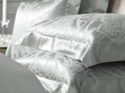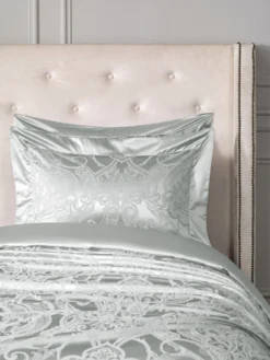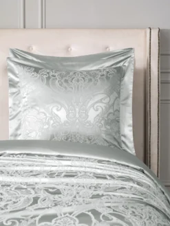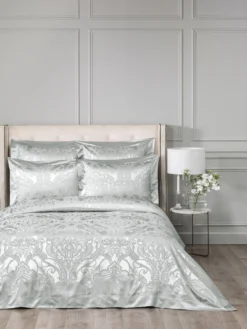 The complex weaving of the pattern is stylized leaves and flowers. It is the famous arabesque pattern, complemented by elements of the Venetian style. The fine texture of the jacquard fabric and the elegance of the ornament emphasizes the smooth, satin border of pillowcases and duvet cover.