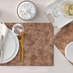 “Danford” is a traditional rectangular placemat decorated with the Togas logo. The peculiarity of its design is an imitation of exquisite Venetian plaster. The surface of the placemat attracts attention with beautiful transitions of noble shades – from gold to red-brown dark brick, like the overflow of the color of the famous Venetian plaster imitating natural marble. Such a placemat will become a table decoration.