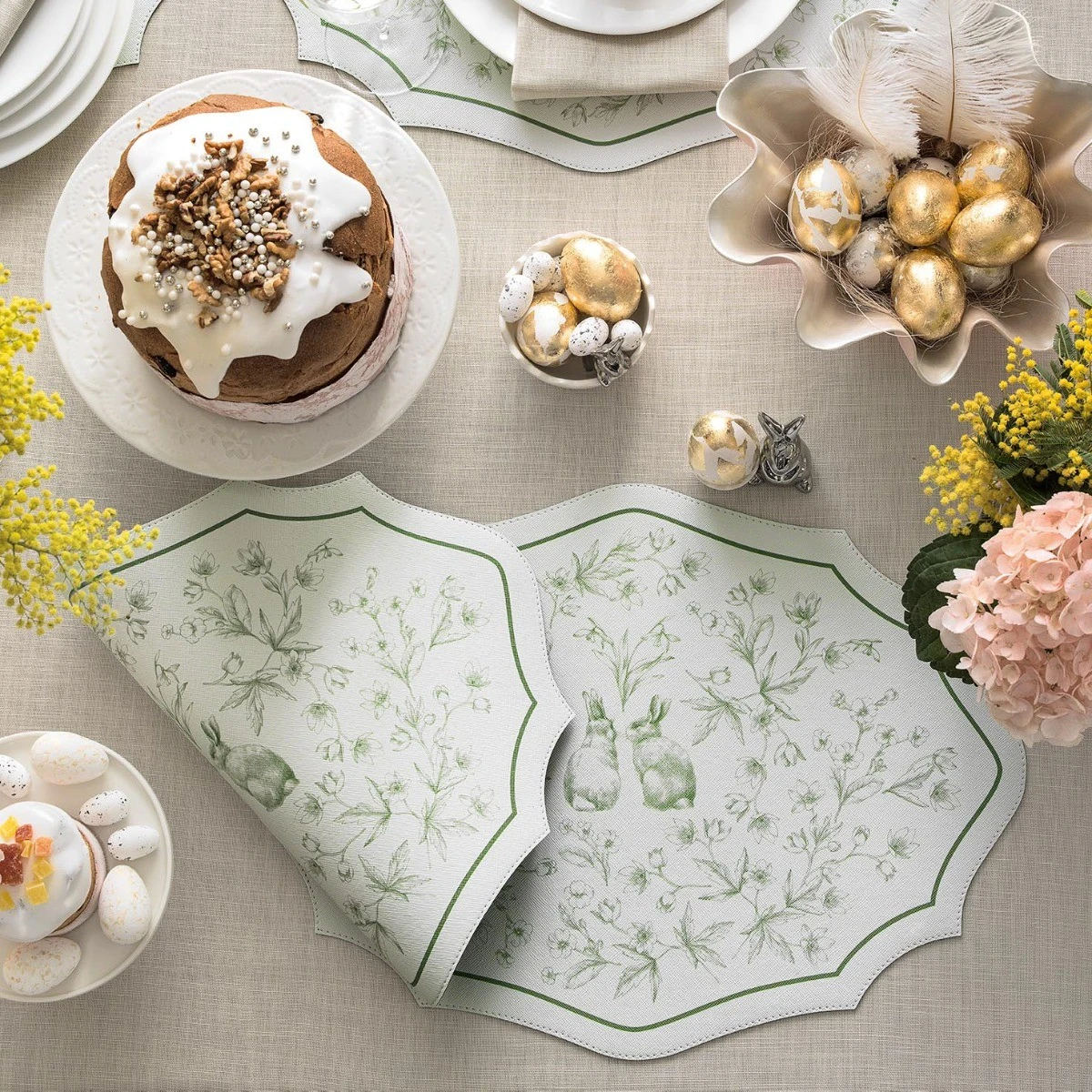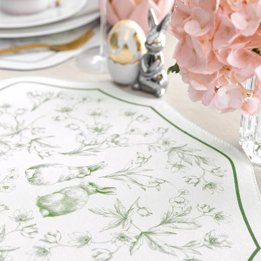 Falber is white color, intricate ornate edges and an Easter-themed ornament. The placemat is double-sided – the front side is decorated with a fine monochrome print – bunnies among the gorgeous flowers. A pastel pattern in the shades of the first spring greenery will be an additional decoration for a celebration.