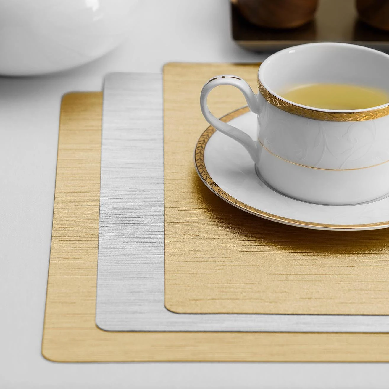 Elvy’s feature is its posh design. The model is decorated with an imitation of weaved golden threads forming an openwork shining pattern. A set of such placemats will give the set table a smart look, golden threads will emphasize the festive glow of glasses and dishes. This accessory will decorate elegant dining rooms in the Art Deco style, will look great in a classical environment.