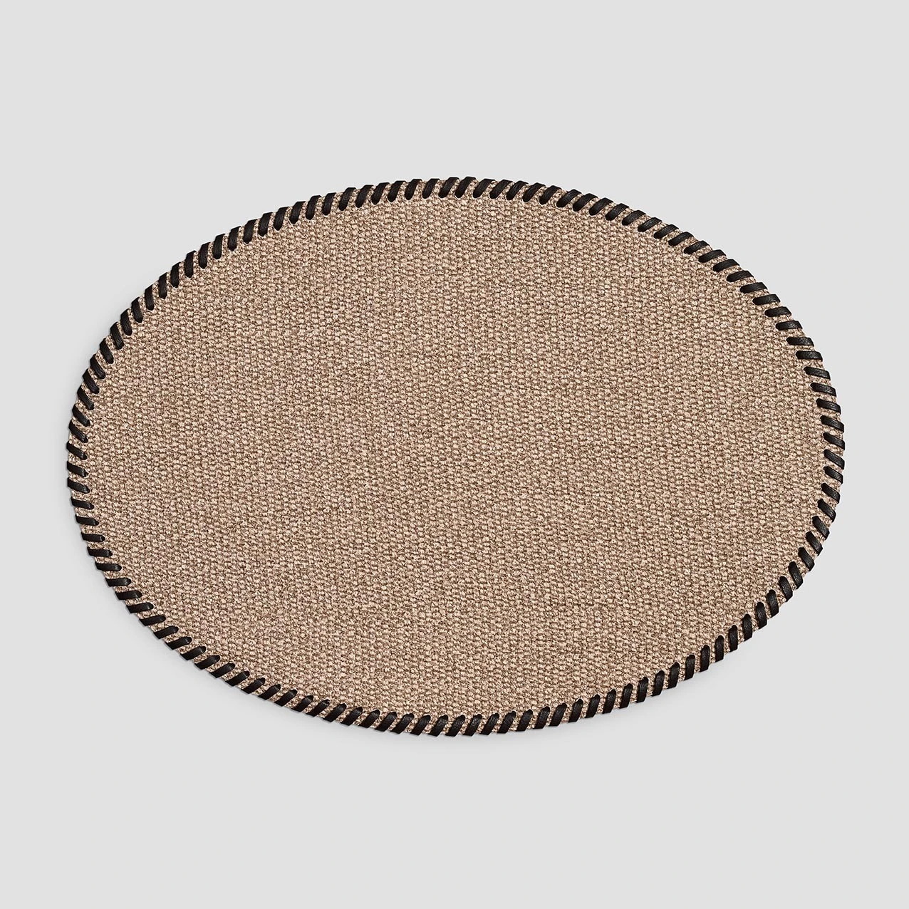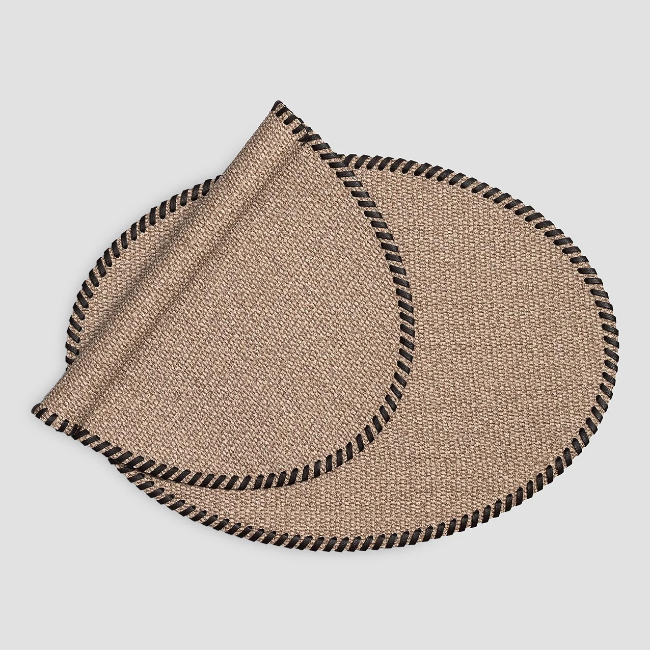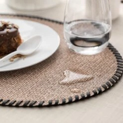 The placemat is made in the trending handmade style with an unusual edge trim. The textured surface of the placemat resembles a basket fabric in its texture and pattern that looks like an interlacing of threads. The edges of the item are hand-stitched with a cord of contrasting natural leather. The chocolate-colored cord stands out against the light brown background of the placemat.