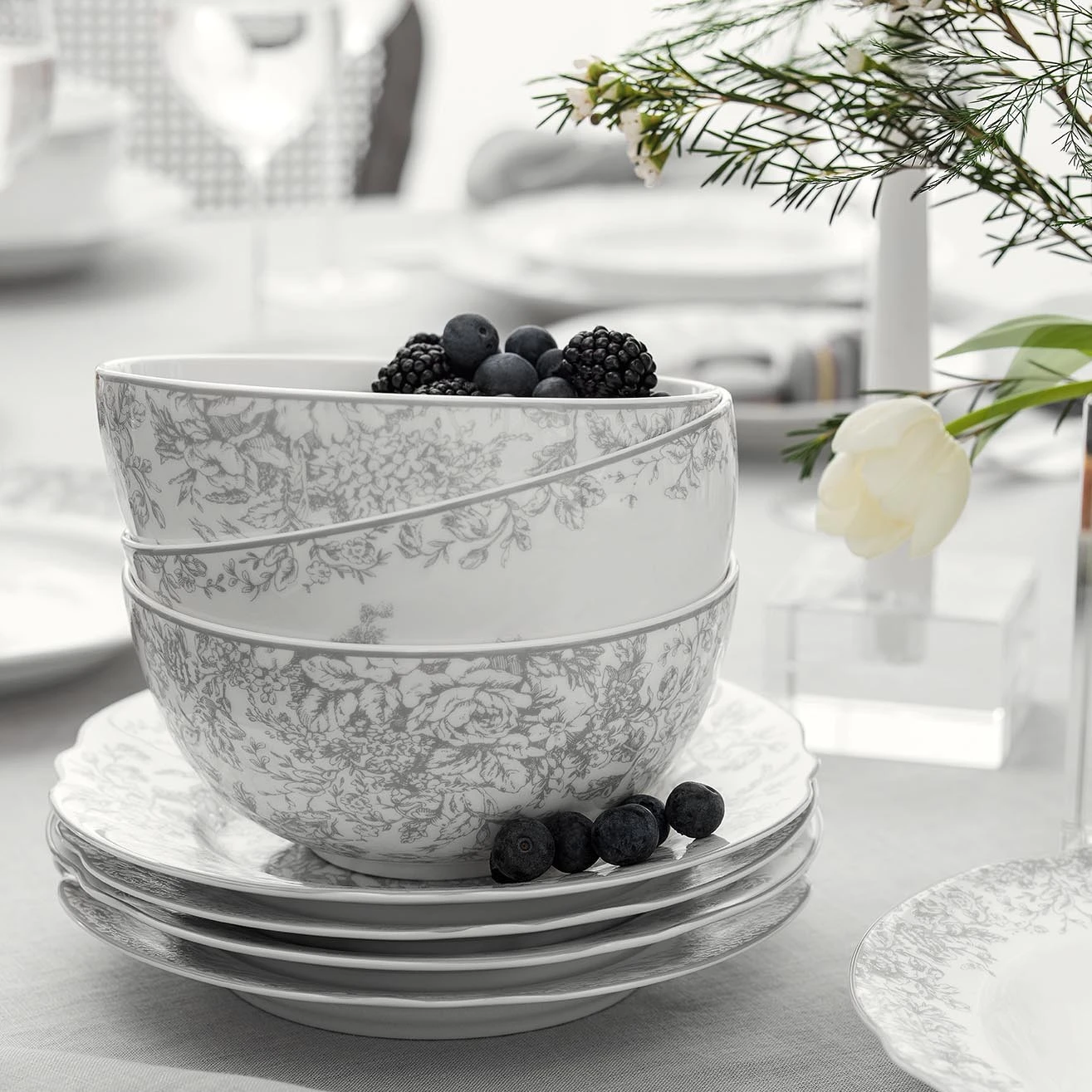 Martinelli Natur represents the porcelain polish and the delicate lines of the Toile de Jouy pattern that adorns all the tableware of the collection. This is an exquisite floral ornament in monochrome, applied by hand in the decal technique on each item. The fine silver-grey lines of the pattern make the Martinelli Natur collection absolutely exquisite.