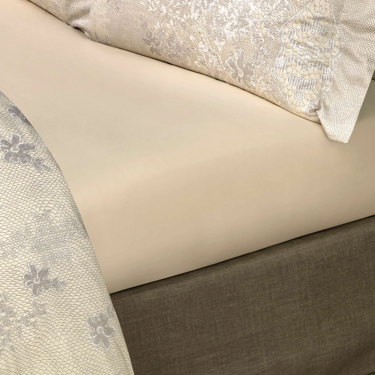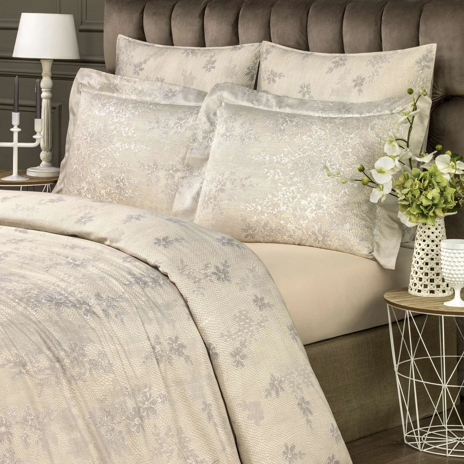 An unusual thin drawing of details of floral patterns creates the effect of delicate handmade lace. This set impresses with its elegance and lightness. The bed sheet and the back side of the pillowcases are made of cream-color fabric.