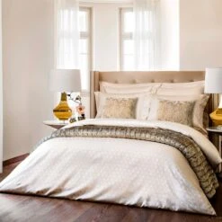 Palmetto was widely used in the days of the Egyptian pharaohs, later in ancient culture, it is one of the iconic ornaments of the Art Deco era. The set is decorated with decorative borders of smooth satin silk around the perimeter of the pillowcases and the front of the duvet cover, made of the same fabric and sheet, silky and very pleasant to the touch. Bed linen is made of long-fiber cotton of the highest quality, which ensures high hygiene and durability. The exquisite jacquard model combined with elegant art Deco ornament is the style and elegance of the bedroom interior.