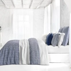 Set ‘Corinthia’ is decorated with the most famous antique ornament – meander. Characteristic geometric meander weave, made in dark blue, decorate the duvet cover and pillowcases set.