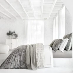 The fine-drawn leaves and stalks resemble the old technique “grisaille” that allows the artist to achieve the effect of capturing the entire ornament in a haze, filling it with the freshness of morning cool. The pillowcases feature a decorative border, while the reverse of the duvet cover is made of the companion fabric in ash gray. The set uses high 300ТС cotton sateen that was subject to double mercerization and calendering that offer high hygienic and aesthetic properties.