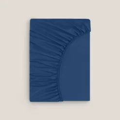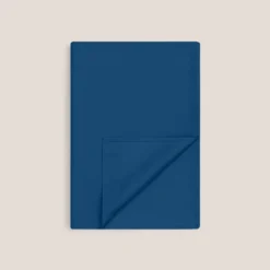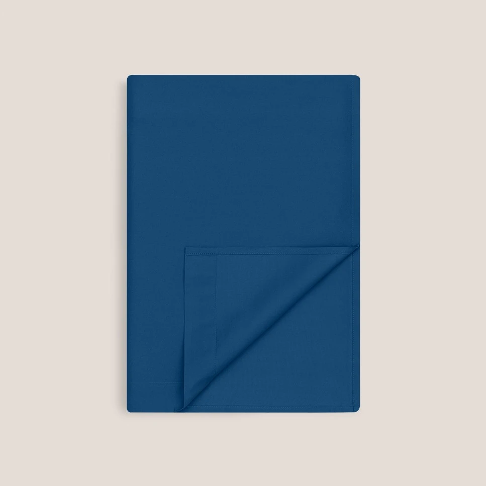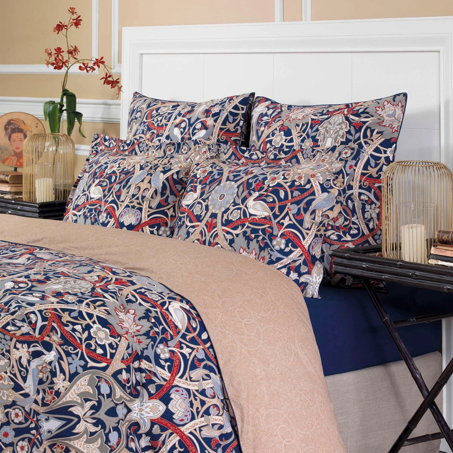The outstanding smooth surface is produced by brushing of weft threads. Reactive printing technology is used to give the fabric the sharpness of the design and superior color retention. The bedding set features floral motifs inspired by the Japanese period of a Pre-Raphaelite artist William Morris, with their bent lines and repetitive pattern of the paradise garden and birds of paradise as a symbol of happiness, love, and prosperity. The main color is dark blue with contrasting accents of red and beige.