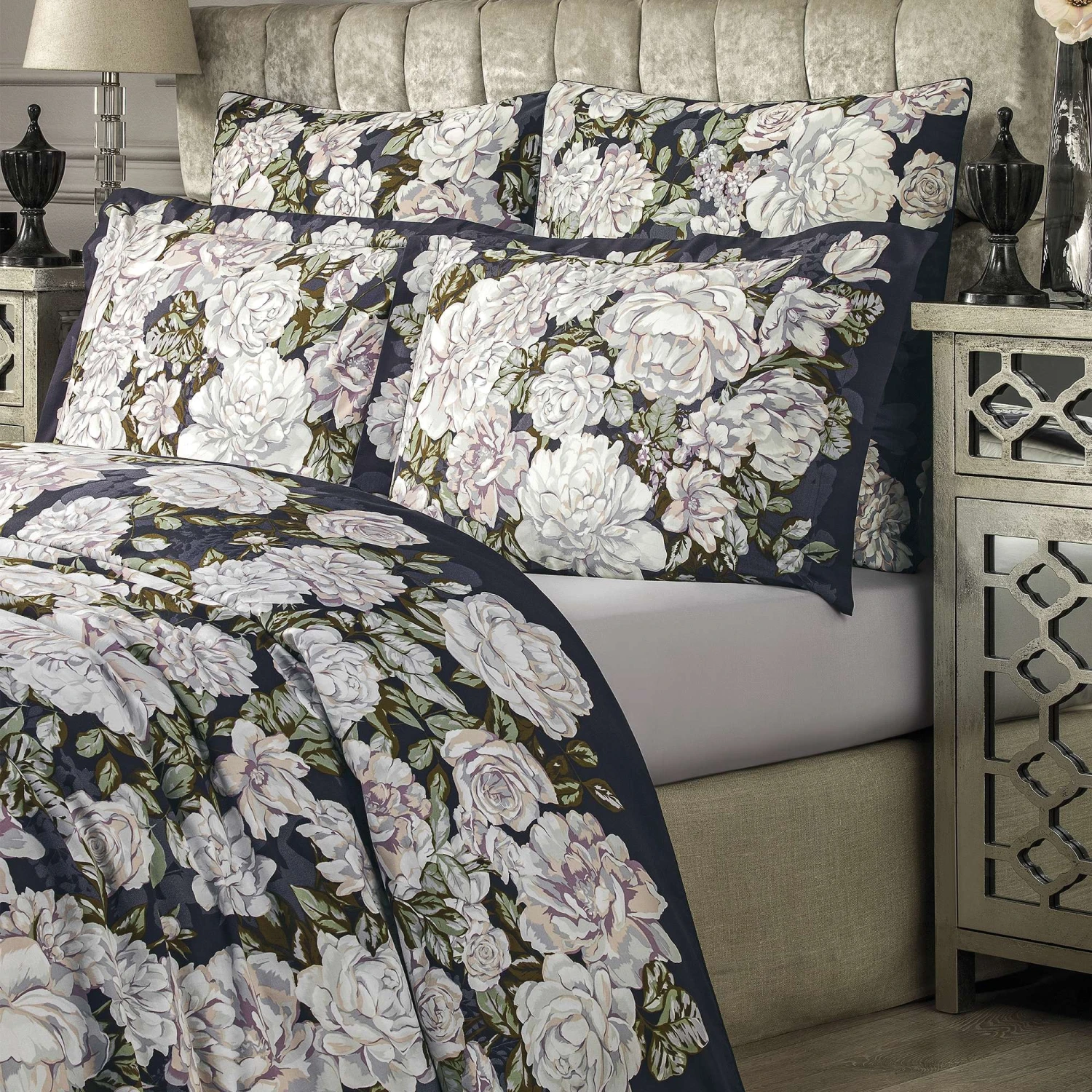 A saturated and dynamically contrasting composition of blossoming peonies (a symbol of love, wealth and prosperity) in soft lavender and peach tones sits on a dark ground. The designer got his inspiration from ancient luscious still-life paintings made by Flemish artists. Royal sateen is made from the world’s best long fiber, fine fiber cotton of the highest quality, combed and mercerized, resulting in a stronger, more gentle and softer to the touch fabric.