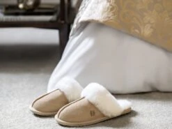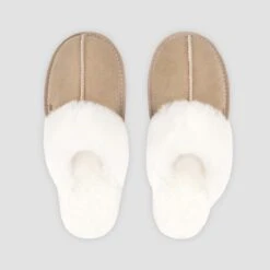 This is a natural material that provides good air circulation, perfectly absorbs excess moisture, so Slippers will give dry heat and will not cause discomfort from overheating and sweating. Inside the model ‘Amanda’ – snow-white sheepskin, it also frames the product from the outside, beautifully contrasting with beige suede. Such home shoes will look good with a warm Terry robe, knitted home suit, knitted sweater.