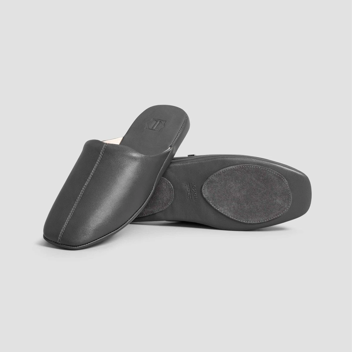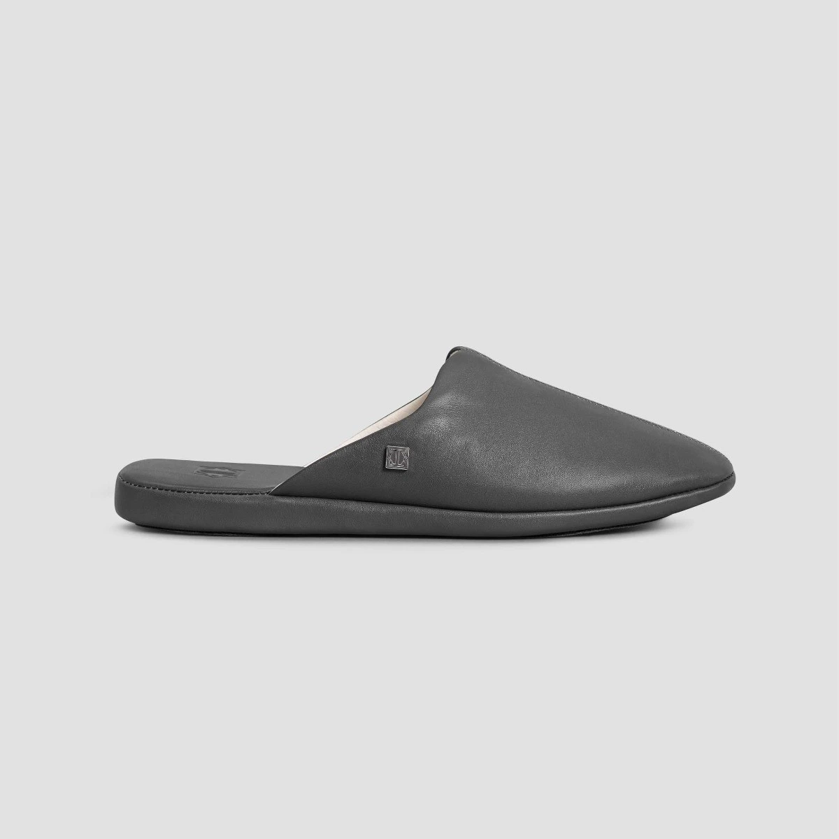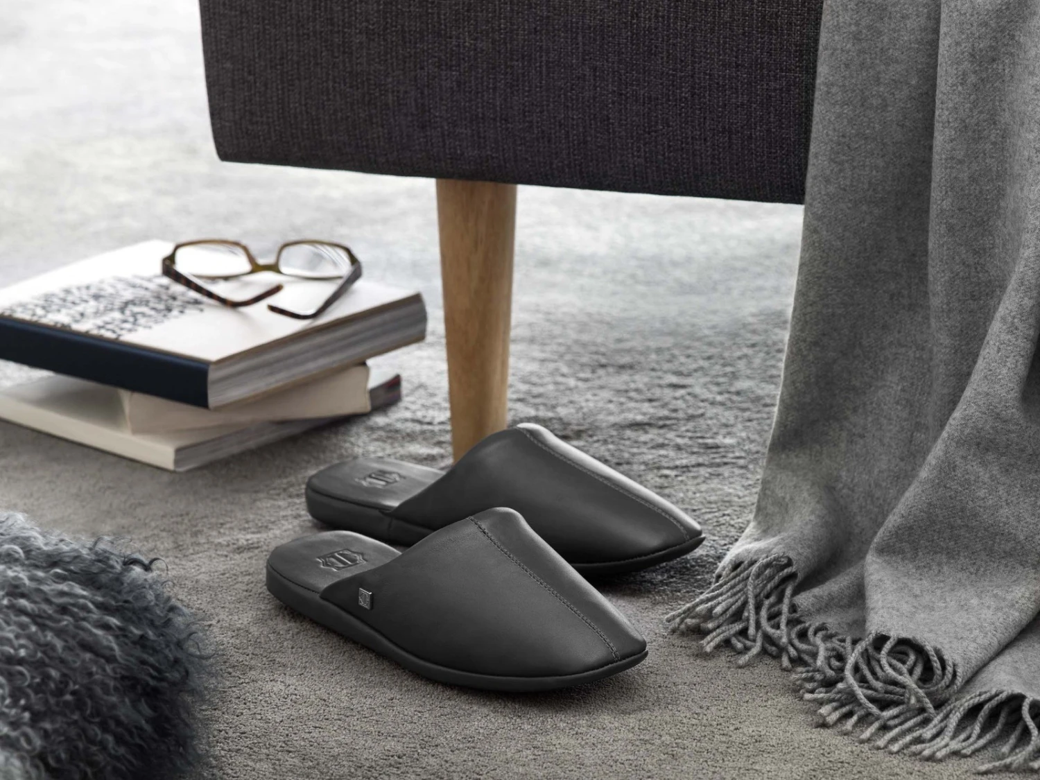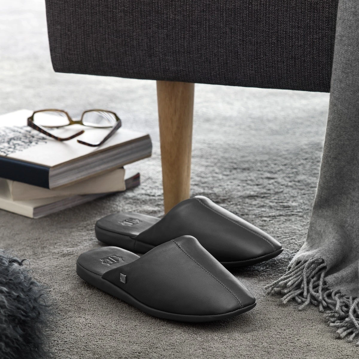 Graphite color and shining genuine leather of high quality is a great solution for a man who knows his worth and wants to be stylish even at home. The leather insole of the Slippers is decorated with an embossed Togas logo. This beautiful model is offered in an elegant velvet storage bag and will be a perfect gift for a man.